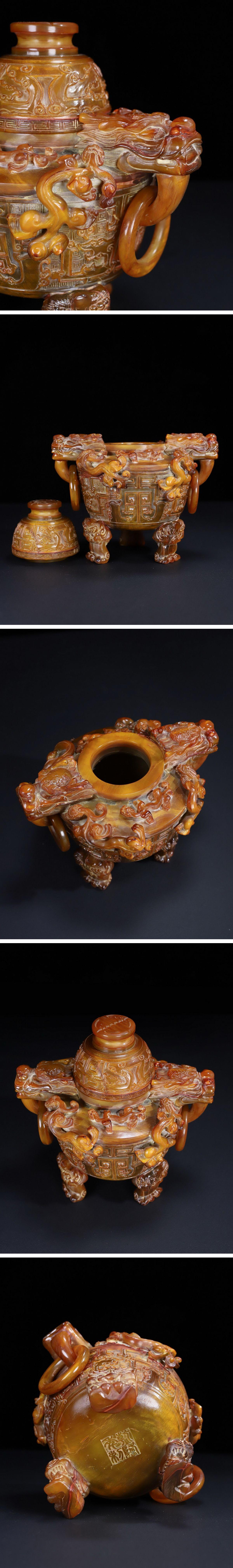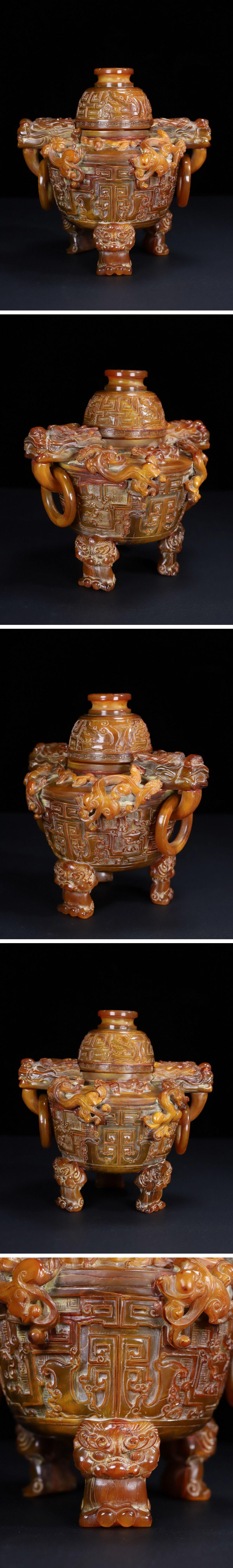【雲錦】1円から 清時代 牛角刻 龍文二環耳香爐 材質保証 時代物保証 古美術 骨董品8L20-2JS9