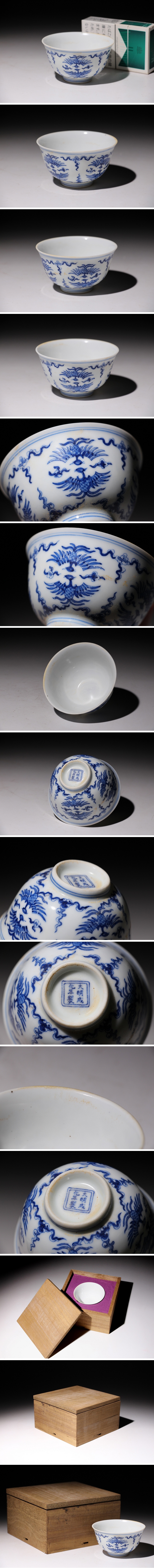 ☆寒椿☆大明成化年製 染付碗 鳳凰紋 直径約8.4cm (検)青華 鉢 茶碗 唐物 中国美術 古玩 收藏
