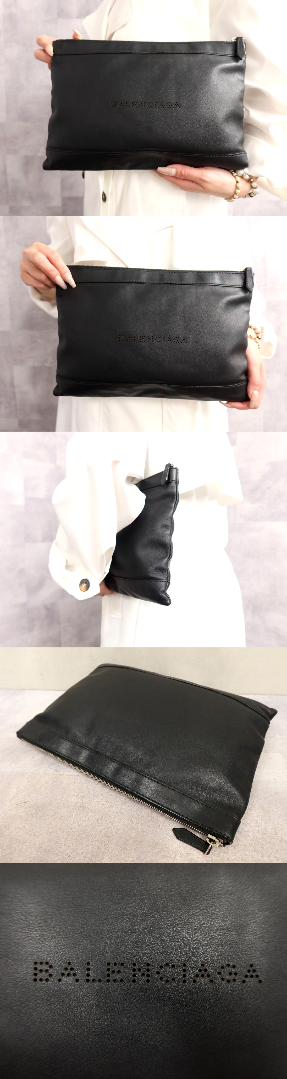 ●超美品●バレンシアガ●ネイビークリップ●パンチングロゴ●カーフ レザー 本革●セカンド クラッチ バッグ●黒●シルバー金具●Js66605 收藏