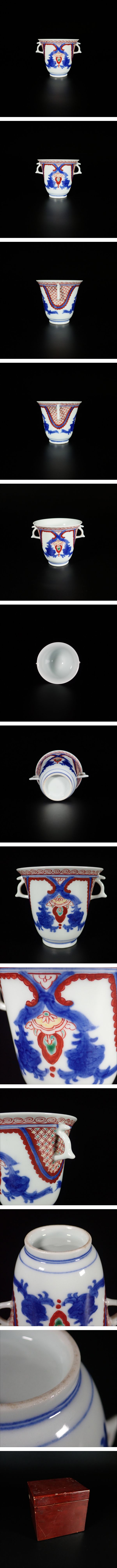 ■ 商品説明 端正な造形が美しい、古伊万里の色絵耳付猪口。 見込みには瓔珞文様を思わせる意匠が配され、赤と染付の対比が印象的な一品です。 両側に付けられた耳は丁寧に成形され、全体の姿に上品なアクセントを添えています。 このような耳付の猪口は意外に見かけることが少なく、器形としても魅力的です。 薄手で整った作りからは、当時の高い技術がうかがえます。 |