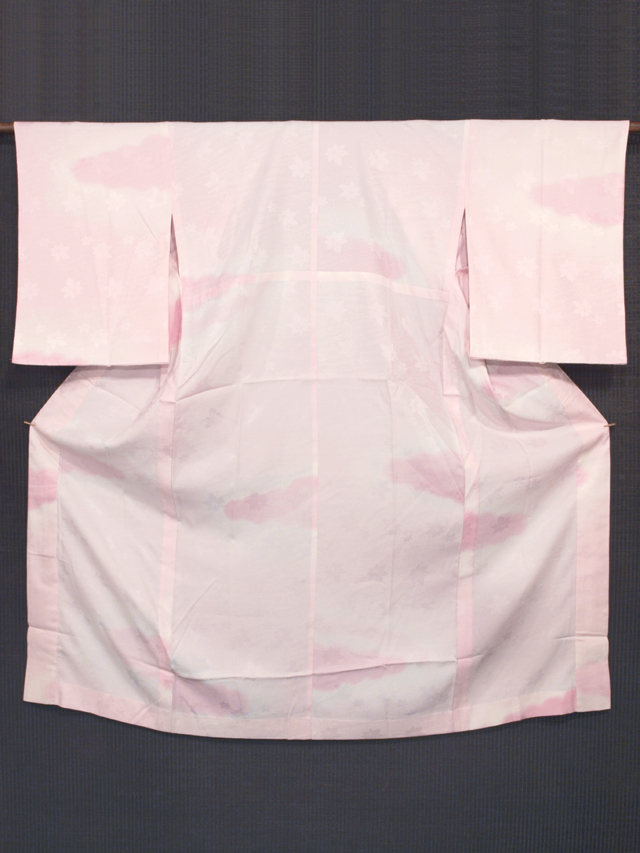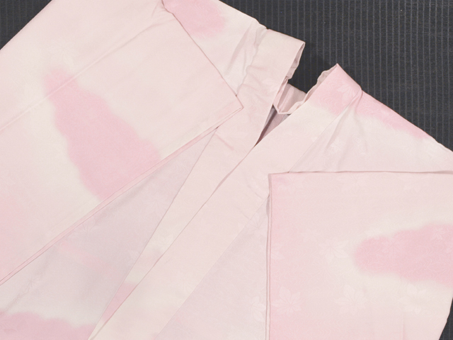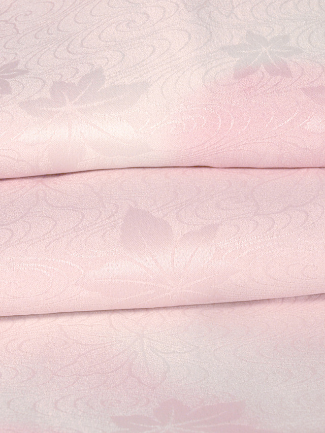 白色の地に、竜田川(楓と流水)の地紋が織り出され、淡い桃花色で雲霞(うんか)の文様が染められている、紋綸子縮緬の洗える着物の長襦袢です。袖無双仕立てです。 とても品の良い意匠です。やわらかでなめらかな手ざわりの上質な化繊地です。 ユーズド品としてはいますが、使用感は感じられず、しみやよごれ、褪色などのダメージもなく、とてもきれいな状態です。 |