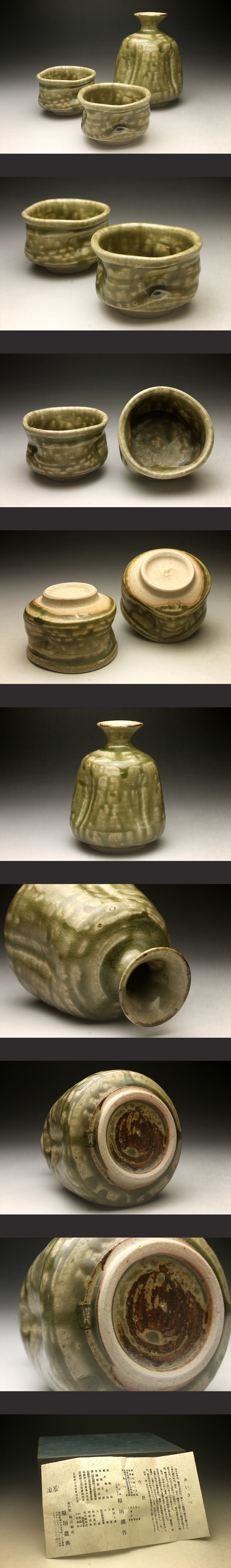 【余韻】 稲垣盈典作 赤津焼 伊羅保 酒器揃(3点)★徳利 ぐい呑み 2点 化粧箱<同梱可> 收藏