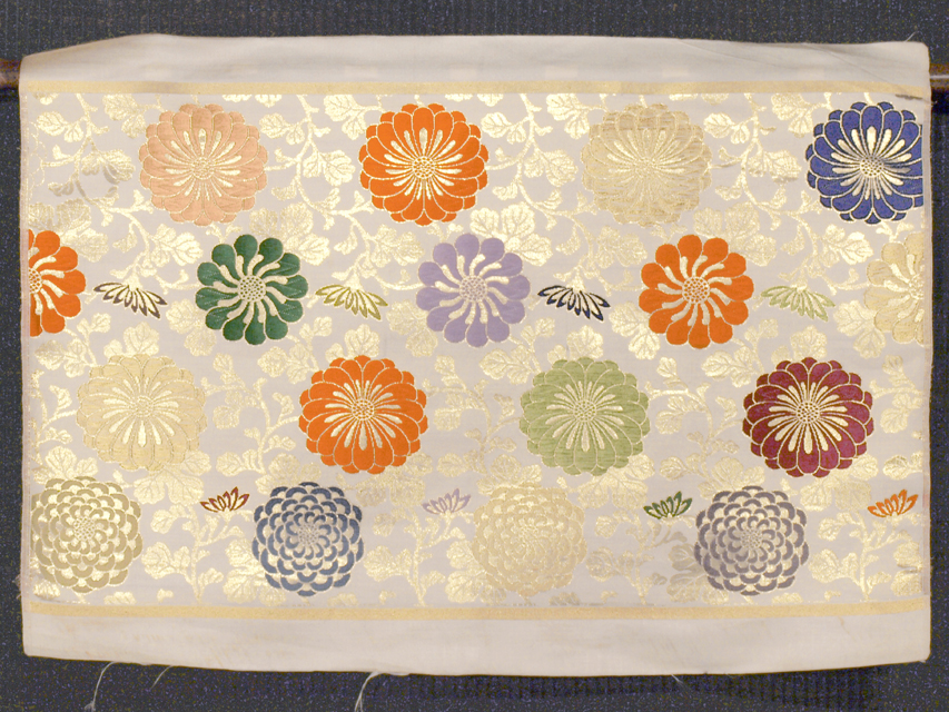 ややきなり色がかった白色の地に、更紗調の菊唐草の文様が織り込まれた、本金箔の西陣唐織の錦織の帯地のはぎれです。丸帯の残布と思われます。 明治末から大正期ごろにつくられたと思われるアンティークのお品です。オリエンタルな意匠が華やかで豪奢な雰囲気であらわされています。 残布なので未使用保管品です。端部にうすよごれなどはありますが、そのほかに目につくしみやよごれ、褪色などのダメージはなく、この時代のものとしてはとてもきれいな状態です。布地の力はあります。 |