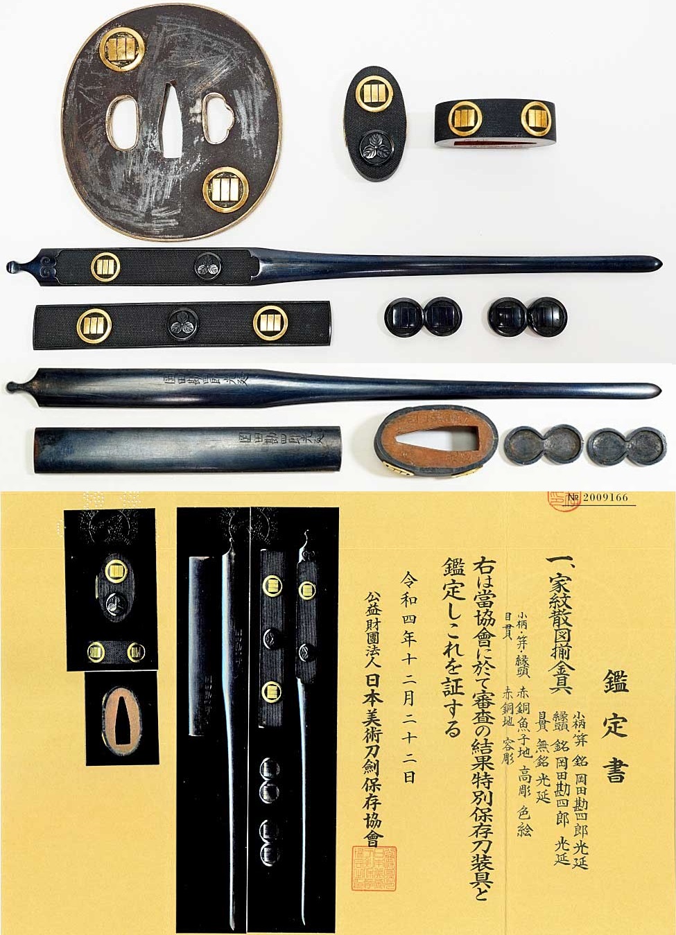 銘:岡田勘四郎光延 赤銅地丸に算木 丸に三つ柏家紋散図揃金具(縁頭 小柄笄 目貫 鍔) 特別保存刀装具鑑定書附 状態抜群 太刀 拵 收藏