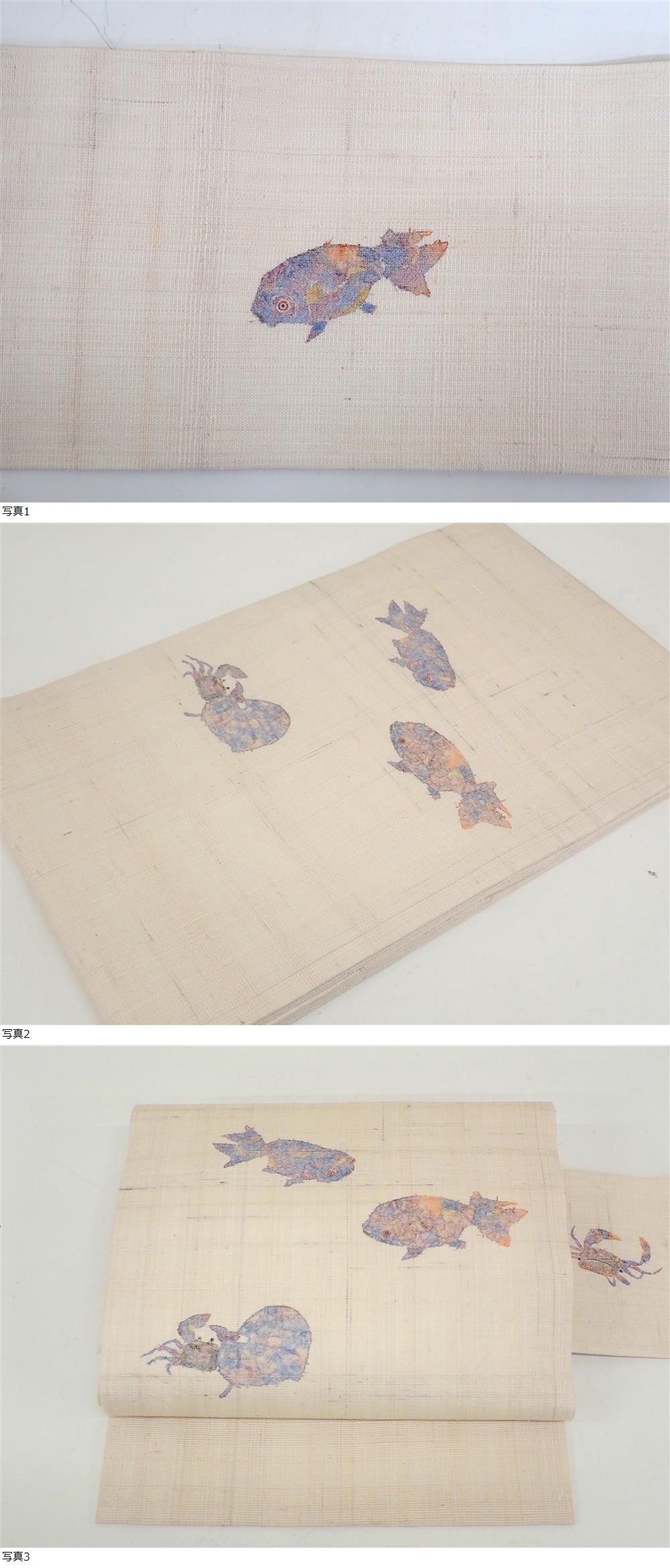 逸品 未使用 麻 麻地色 手描 九寸名古屋帯 魚文 蟹文 31cm×373cm 風情の夏帯 | ||||
