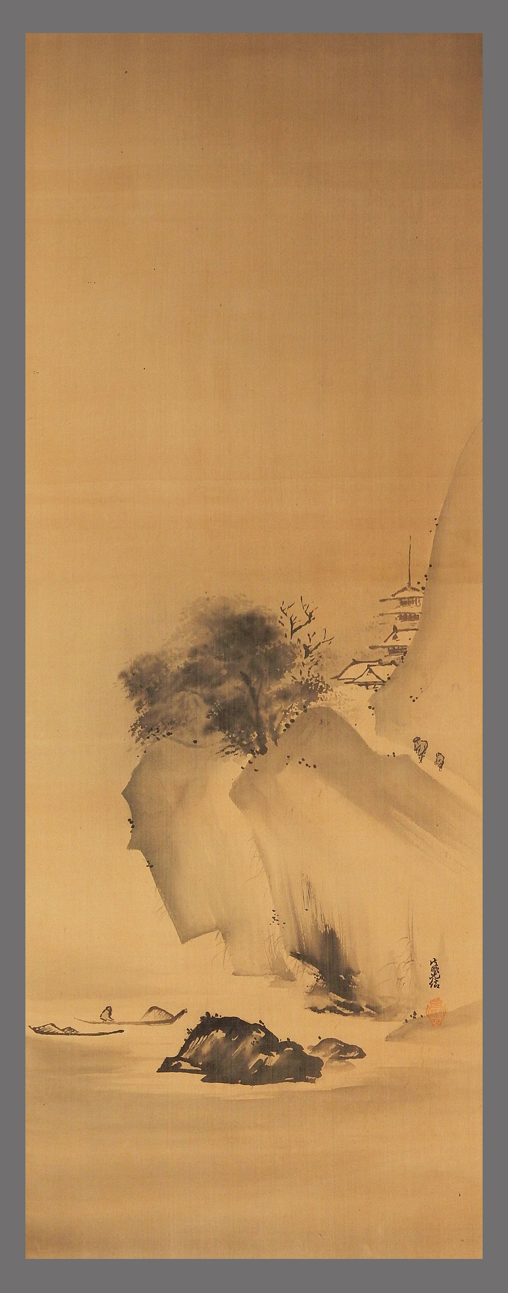 【真作】■狩野元信■水墨山水之図大幅■古筆了信鑑定箱■室町時代の絵師■肉筆■掛軸■掛け軸■日本画■ 收藏
