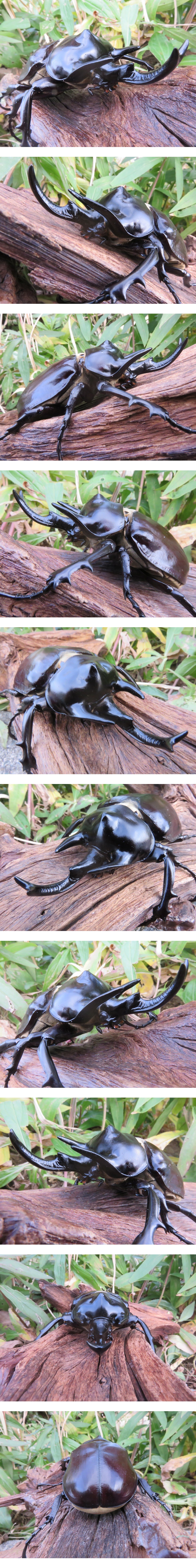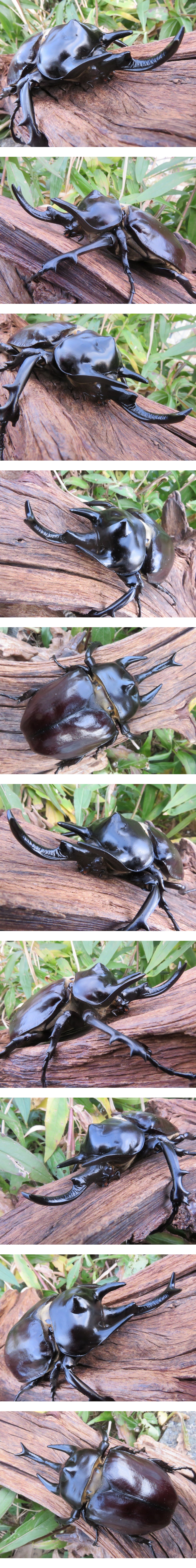 計測方法は、虫を平らな所に置き、ノギスにて計測し、頭角先端~上翅末端までの最大値約103mm、お尻までの最大値約105mm