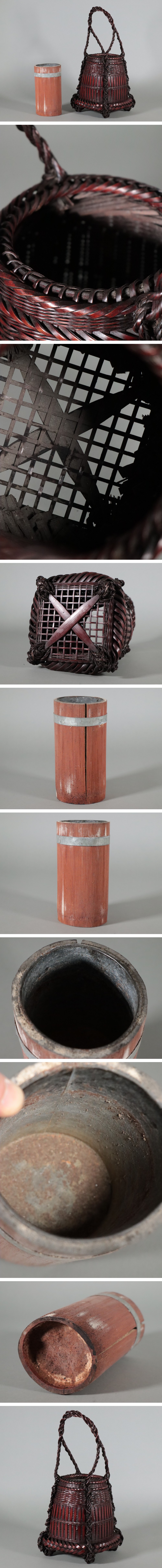 【UAK】 古竹造 煤竹 竹編 網代細工 提手 花籠 花篭 / 竹製 花入 / 花器 花瓶 時代物 骨董品 古美術品 / 高さ46cm 收藏