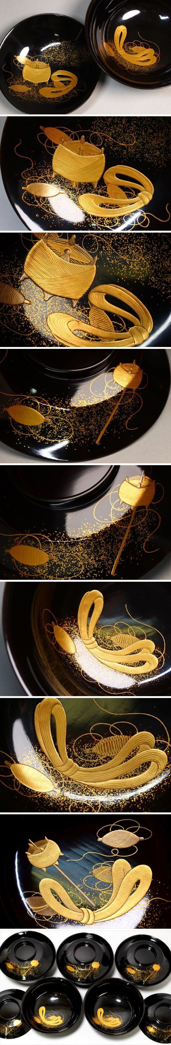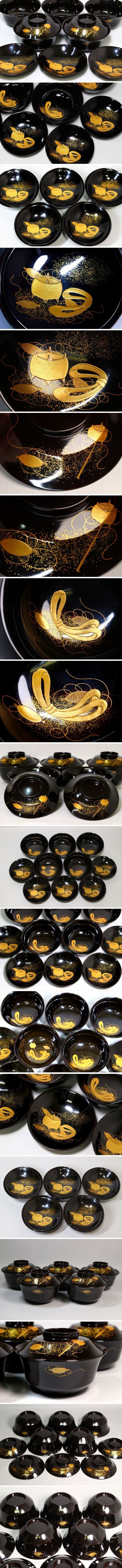 状態良好で綺麗です。最上作 加賀蒔絵 糸巻蒔絵吸物椀五客です。華やかな糸巻の蒔絵が施されています。すっきりとした形も美しく、見事な仕上がりになっています。細かい所までとても丁寧に造られています。