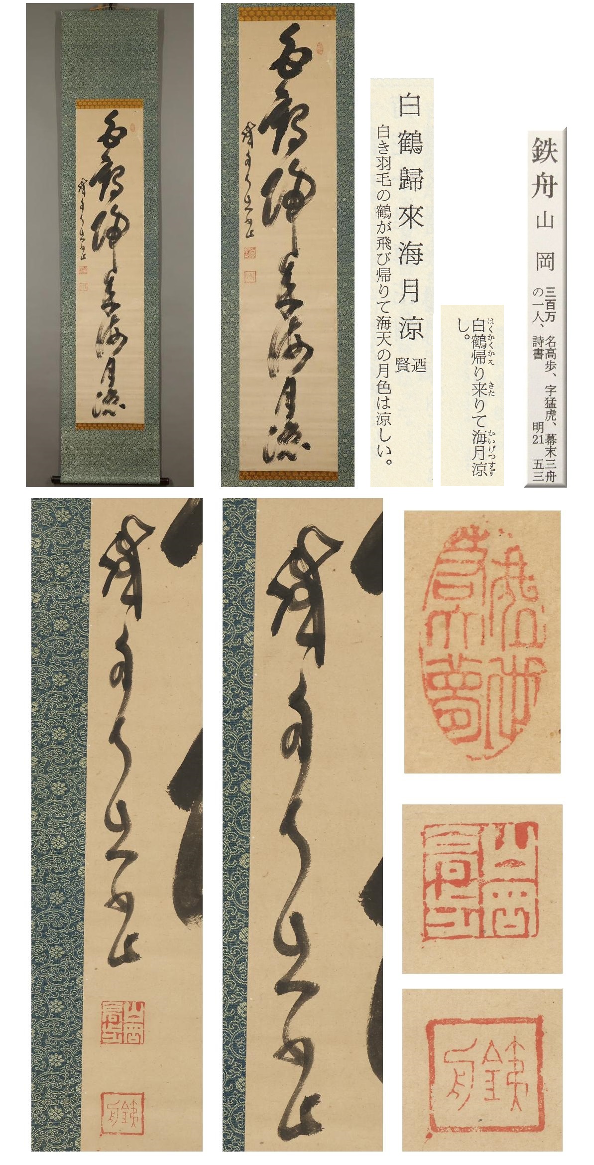 【真作】山岡鉄舟◆白鶴帰来海涼◆一行書◆肉筆◆紙本◆掛軸◆x202 收藏