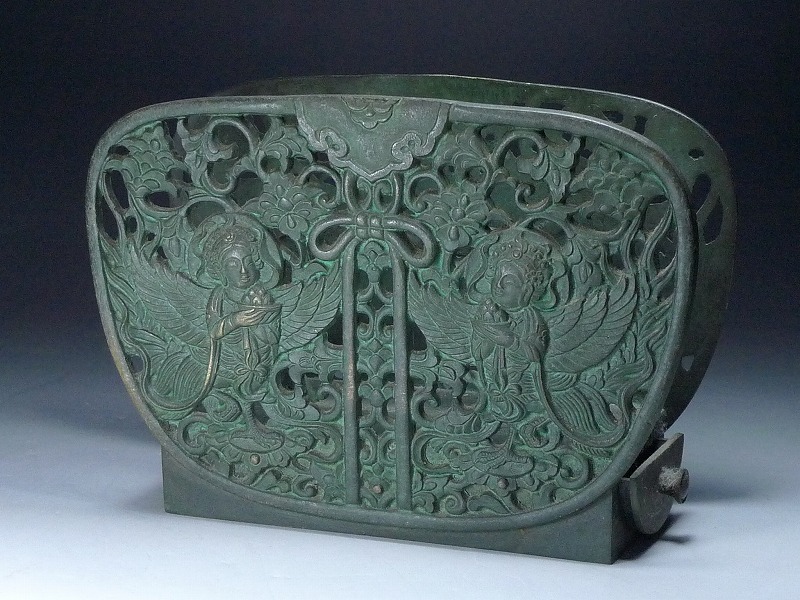 60AM121★仏教美術 迦陵頻伽 華鬘型経文立て 引き出し付き 青銅 団扇立て スタンド ブックエンド 小物入れ 記念品 骨董 收藏