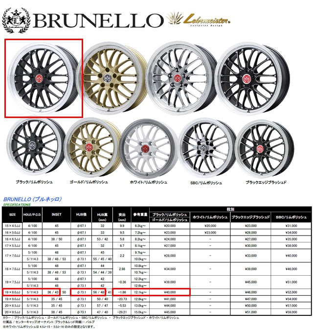 レアマイスター アルミホイール4枚セット ブルネッロ 19x8J 5H/114.3(+43・+36) レクサスGS等に Lehrmeister BRUNELLO 送料別途【長野発】 收藏