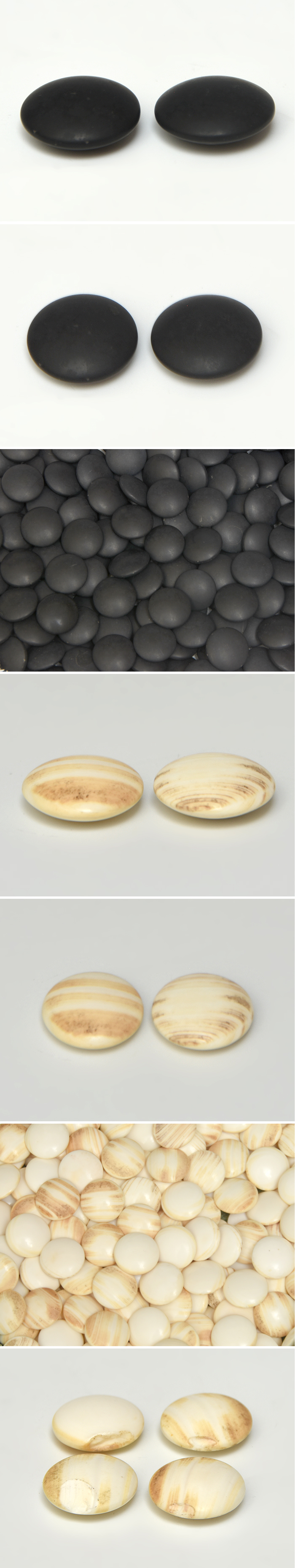 黒(~32号) 直径:2.2㎝ 厚さ:0.9㎜ 個数:181個 重量:6g(一個当たり) 白(~30号) 直径:2.2㎝ 厚さ:0.8㎜ 個数:181個(内4個カケあり) 重量:5g(一個当たり) 碁笥 口径:11㎝ 胴径:14.6㎝ 高さ:10㎝ |