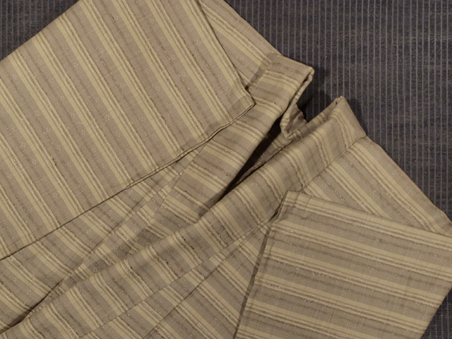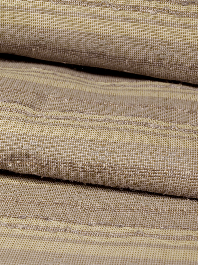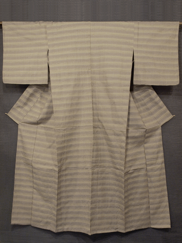 全体的な印象としては、沈んだ淡い柳茶(やなぎちゃ)色と淡い葡萄鼠(ぶどうねずみ)色といった感じのよこ縞の地に四つ玉などの幾何学的な文様が浮き織で織り込まれているウール紬です。単衣仕立てです。 花織風の意匠と織りでモダンな雰囲気が感じられます。ウールのお着物は、お家の中やご近所など普段着としてお召しになれます。お着物に慣れるのにもおすすめです。 ユーズド品です。衿裏が黄変気味で、直径約 1mm-2cm の薄めの黄変がちらほらとありますが、そのほかに目につくしみやよごれ、褪色などのダメージはなく、きれいな状態です。 |