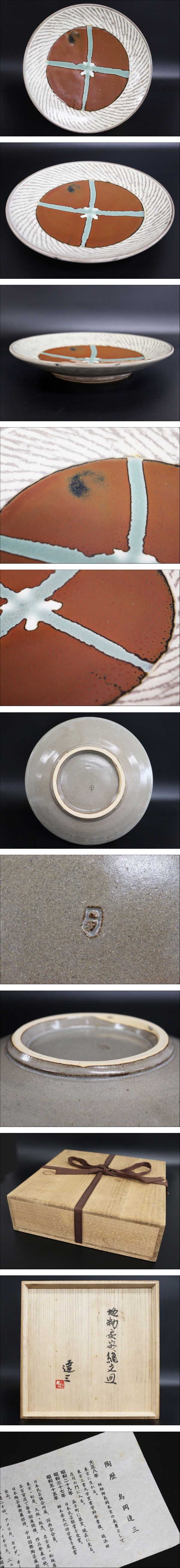 【行董】人間国宝 島岡達三 益子 地釉象嵌縄文皿 径27.2cm 益子焼 共箱 栞 AT090ABC58 收藏