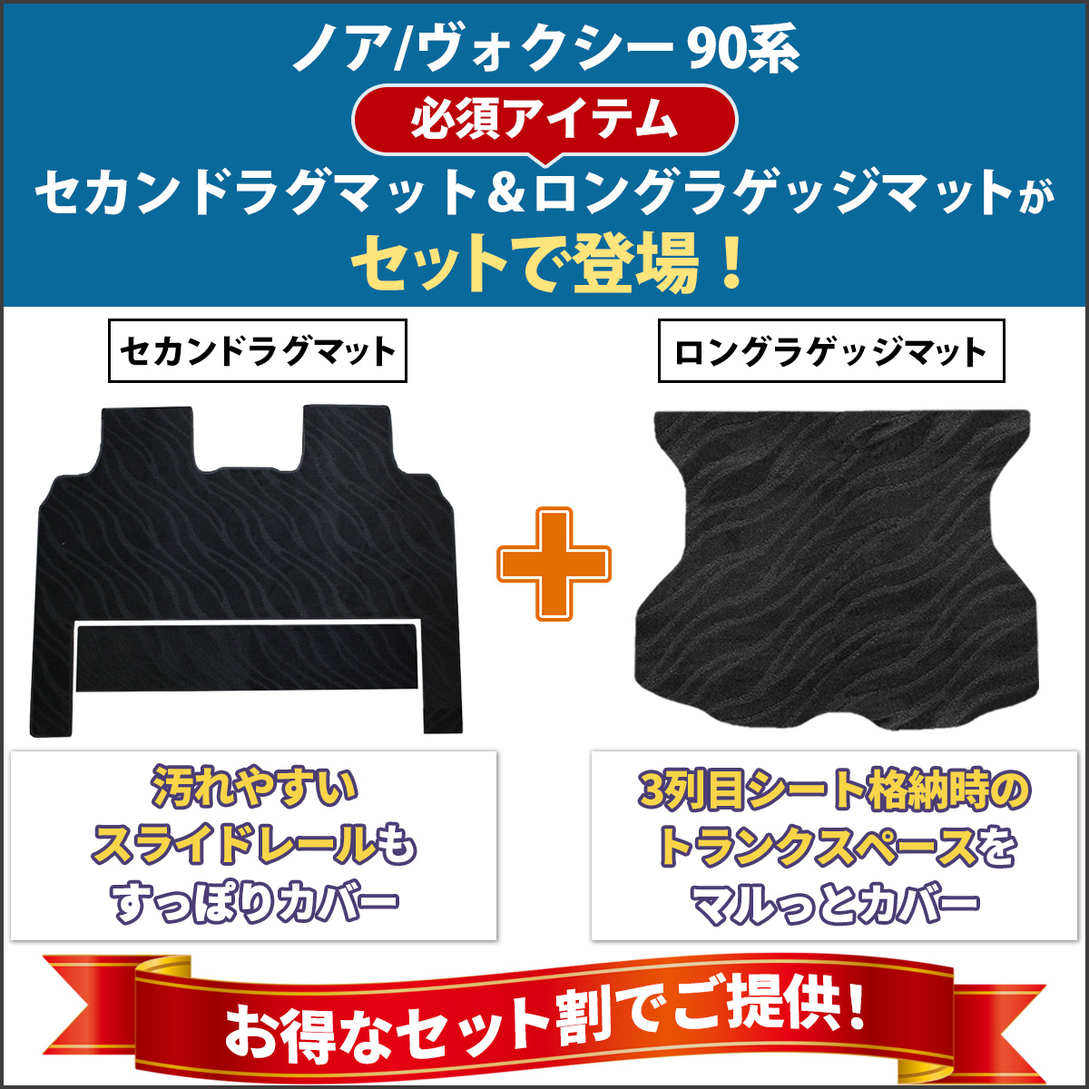 | ■商品構成/td> | ・セカンドラグマット2枚組(2列目のレール隠し用マット) ・ロングラゲッジマット(トランク・荷台部分) | |||