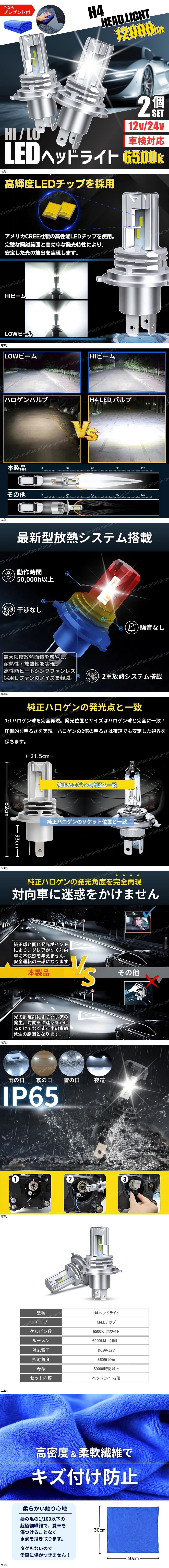 | H4 LEDバルブ ヘッドライト ホワイト 6500K(合計12,000lm) |