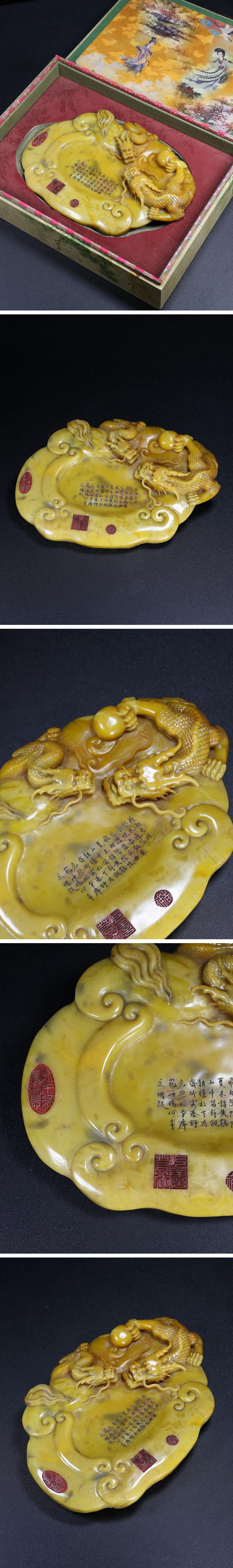 【清】関西某オークション購入 中国伝来 清時代物 寿山田黄石 刻龍漢詩紋文房硯 当時物 時代コレクション8L1-JX10 收藏