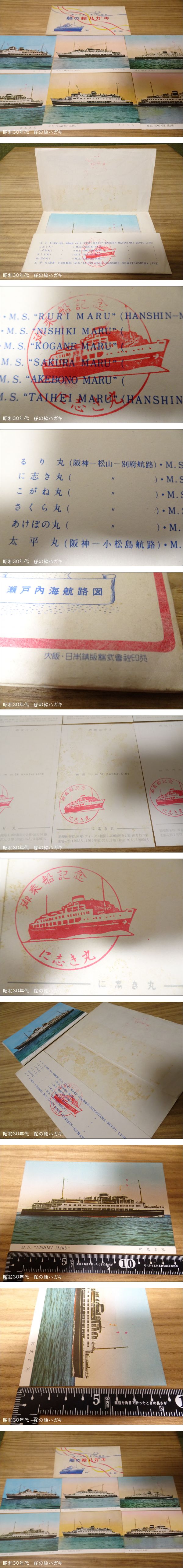 昭和30年代「瀬戸内海」の楽しい船旅 船の絵ハガキ に志き丸 太平丸 こがね丸 るり丸 さくら丸 あけぼの丸 絵葉書 6枚 袋 | ||||||||||||||||
