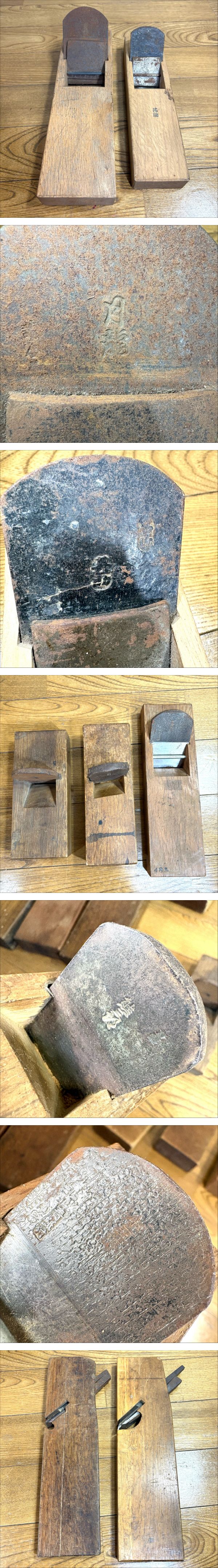 千代鶴などの在銘多数あり!ぜひご確認ください! 〜千代鶴〜 明治〜昭和の不世出の名工・千代鶴是秀(これひで)の技術を受け継いだ、兵庫県三木市の名門鉋鍛冶銘です。主に青紙1号鋼などを使い、伝統的な炭火造りで丁寧な手仕事により作られ、抜群の切れ味と繊細な仕上がりで知られる高級鉋です。 【状態】全体的に小傷、汚れ、サビあり。 | |||||