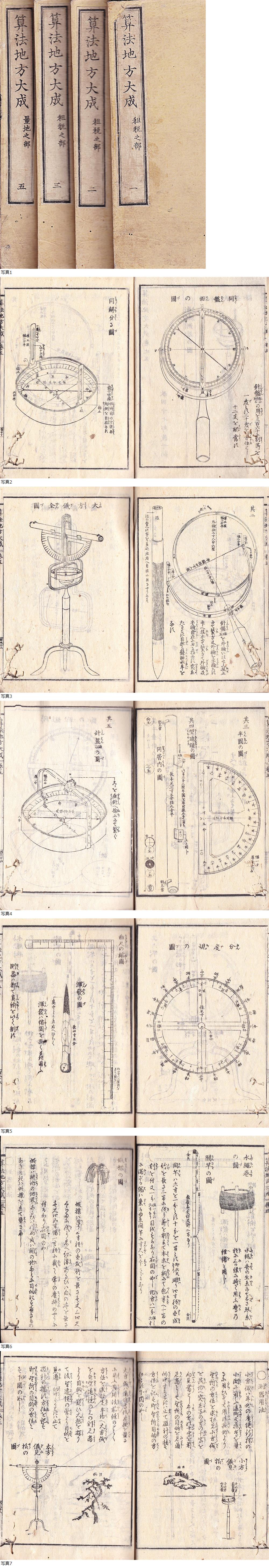 | 江戸下野壬生藩鳥居家の城下屈指の旧家で江戸期を通して本陣及び年寄を勤めた松本家の江戸後期の当主、壬生藩家老で画家の高須甘棠に師事し文人画人としても広く知られた松本甘暁(1814~1896/通称は庄兵衛)旧蔵の算法書『算法地方大成』1・2・3・5巻の計4冊一括(全5冊の内4巻欠) 秋田義一著 天保8年江戸書林西宮彌兵衛他板 挿画多数入 各巻の巻頭と巻末計8箇所に松本甘暁の蔵印「下野壬生城大手南角松本」あり |