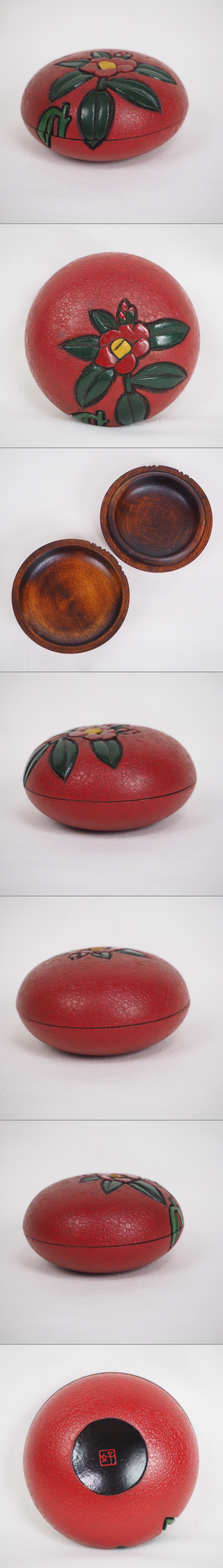 | 商品説明 | 高さ約 3.5cm 幅約 6.5cm ご覧のように、綺麗な椿紋木彫香合です。泡のよう塗り方、なかなか見かけられない技法です。状態はとても良好です、詳しくは写真でご確認ください。 |