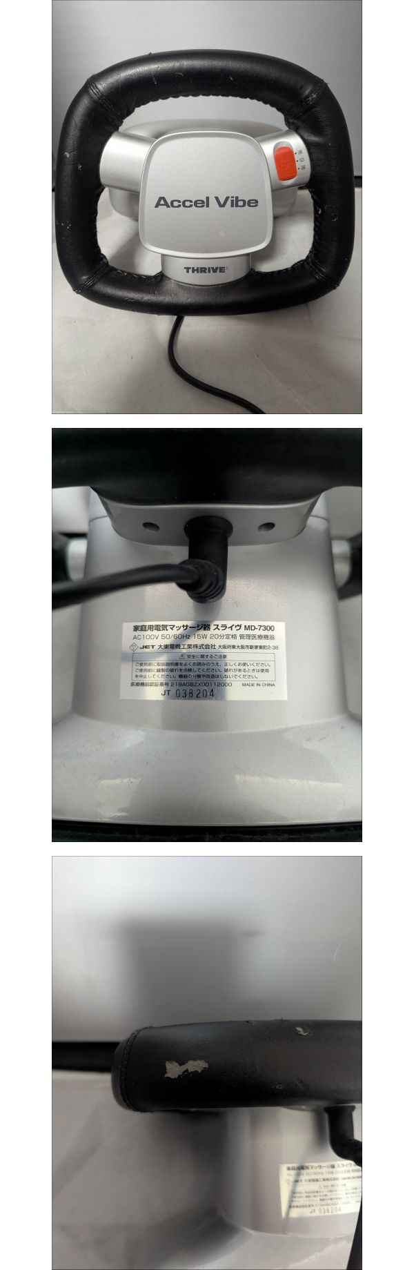 | 商品説明 | 【商品について】 ご覧いただきありがとうございます。 この度出品いたしますのは「 ●THRIVE スライヴ Accel Vibe アクセルバイブ MD-7300 マッサージ機 動作品● 」でございます。 個人所有物の整理のため、出品する運びとなりました。 中古品ではございますが、ご活用いただける方にお譲りできれば幸いです。 商品の状態、付属品、寸法等につきましては、掲載写真にてご確認をお願いいたします。 補足:当方、ペットの飼育および喫煙の習慣はございません。お気にされる方はご参考ください。