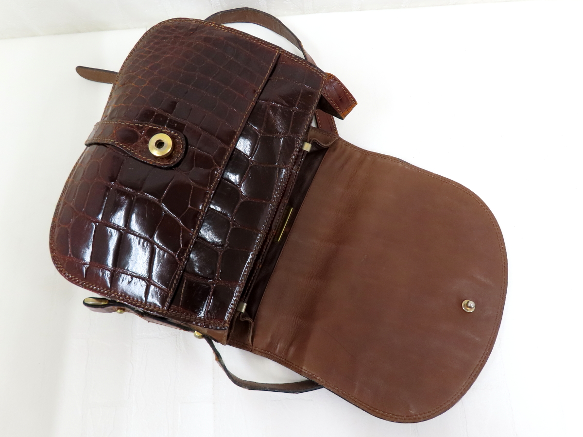 ◆美品◆GENUINE◆シャイニング クロコダイル 本 ワニ 革◆ショルダー バッグ◆ブラウン ゴールド金具◆ヴィンテージ◆イタリア製◆A16724 收藏