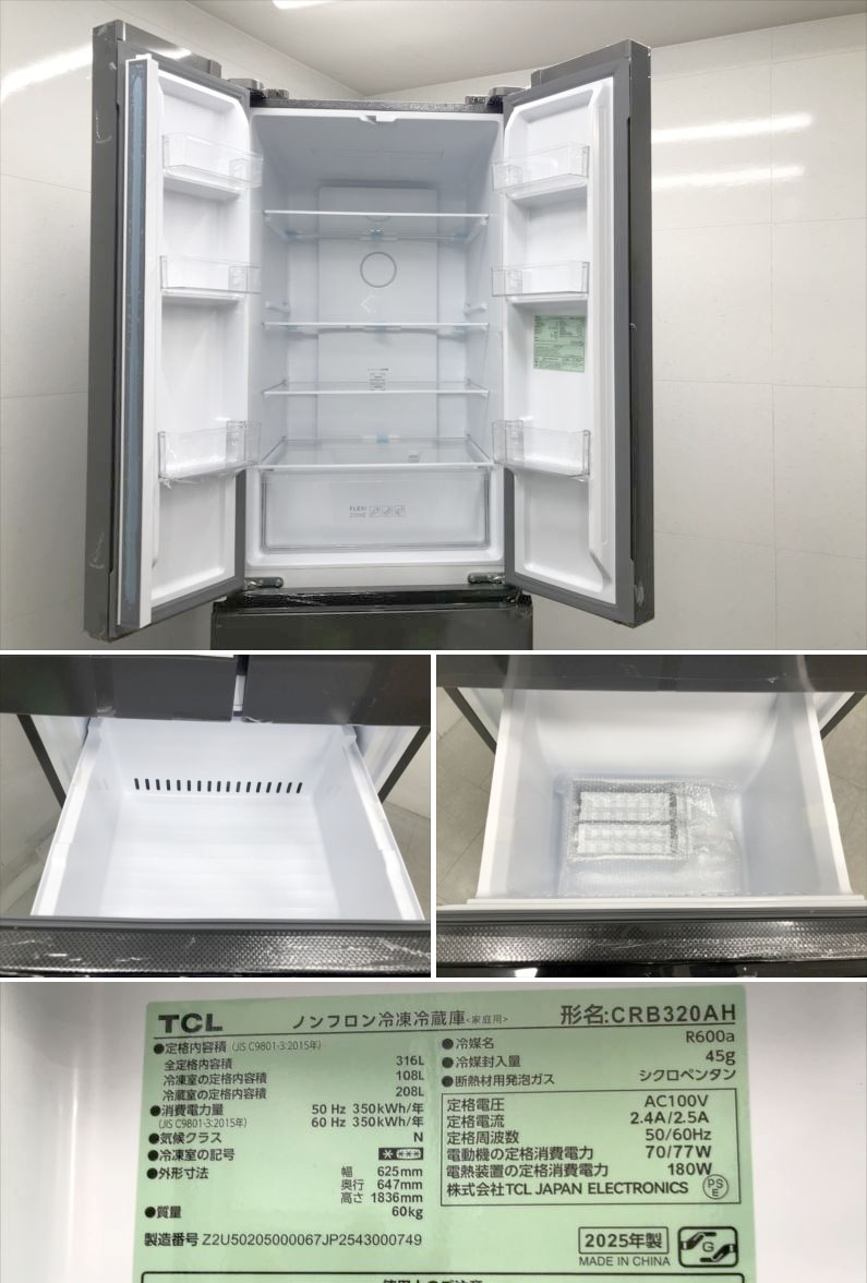 E1641YO ■0116【未使用・B品】冷凍冷蔵庫 316L フレンチドア 4ドア TCL CRB320AH 25年製 家電 收藏
