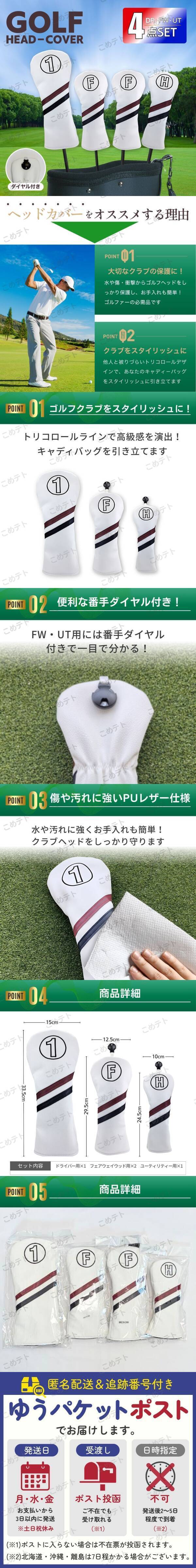 ヘッドカバー ゴルフ クラブ 4点 セット ドライバー フェアウェイウッド ユーティリティ DR FW UT 1W 革 ホワイト 白 紺 赤 ライン 防水 收藏