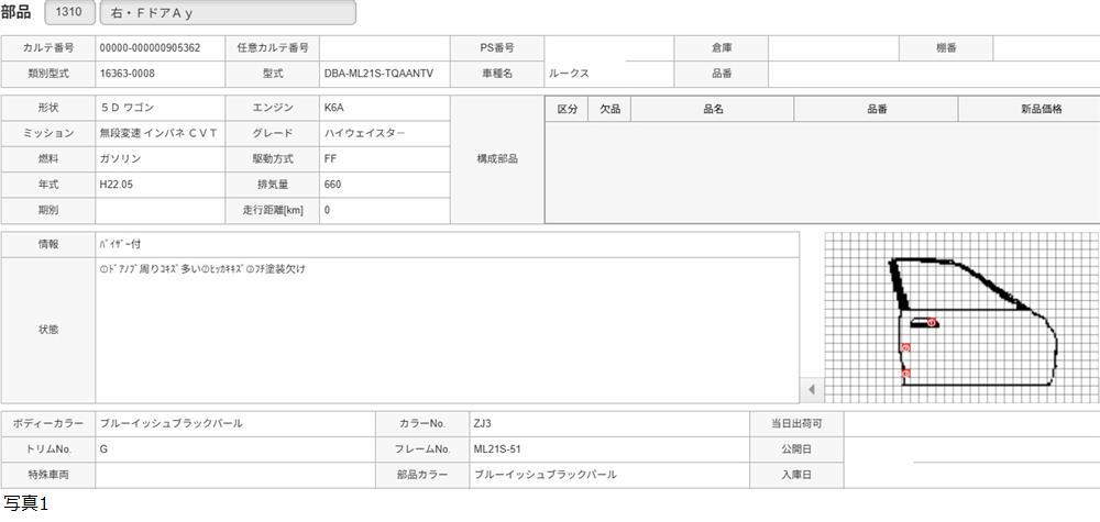 H22年 ML21S ルークス ハイウェイスター カラー:ZJ3 右 フロントドア /送料 L/905362 收藏