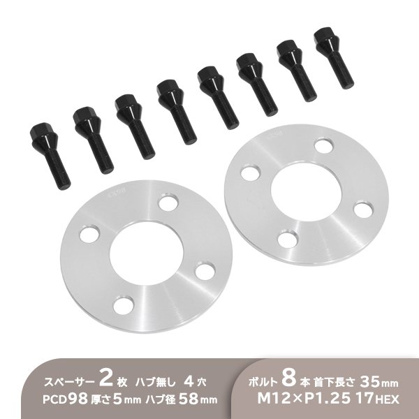 ю スペーサー 2枚 [ 4穴 PCD98 ハブ径 58mm 5mm厚 ハブ無 ]& ボルト 8本 [ M12×P1.25 17HEX 60度テーパー 首下35mm ブラック ] セット 收藏