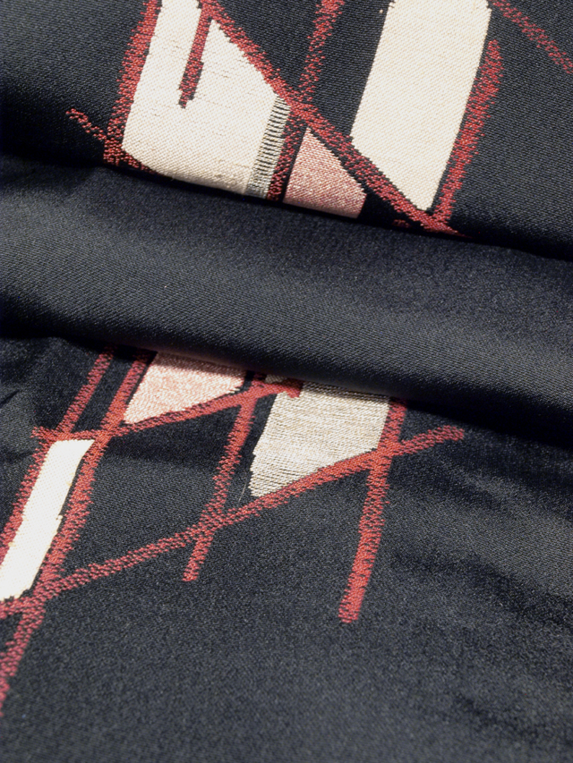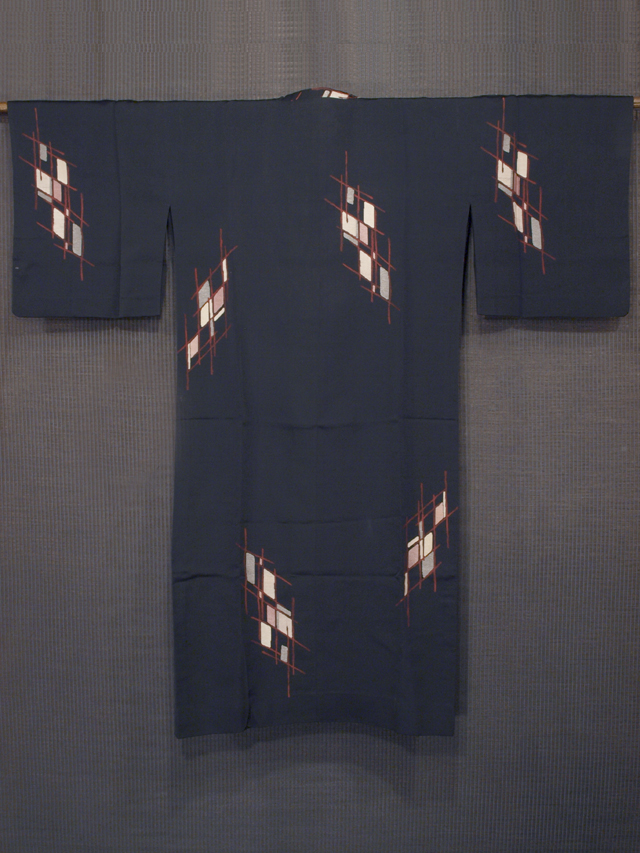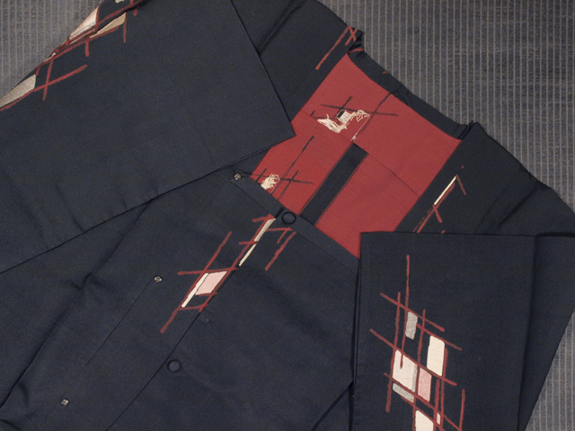 黒色の地に、縫取りでやぶれ襷(たすき)の文様が施されている、お召しの道行コートです。単衣仕立てです。 ほぼアンティークといえるお品です。幾何学的な意匠がレトロモダンな趣を醸しています。 裄出しのあとがうっすらとわずかにありますが、あまり目にはつきません。そのほかに目につくしみやよごれ、褪色などのダメージはなく、全体的にはきれいな状態なので、アンティークにご理解のある方であればご着用は可能です。 |