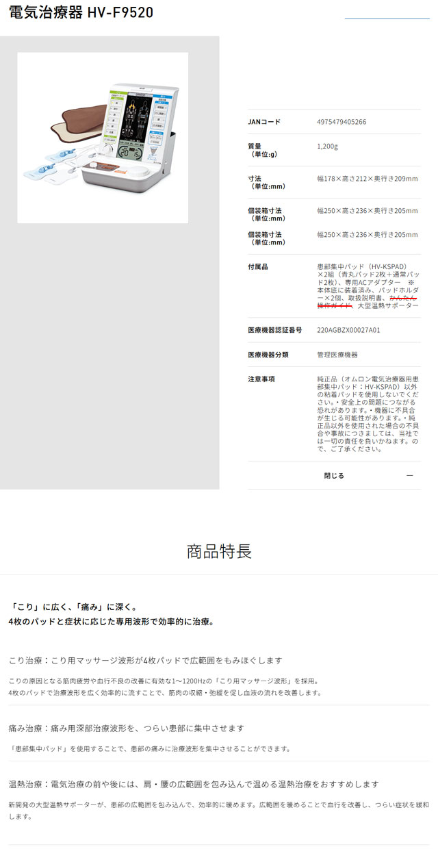 オムロン 家庭用電気治療器 HV-F9520 を出品いたします。 ■特徴■ 「こり」に広く、「痛み」に深く。 4枚のパッドと症状に応じた 専用波形で効率的に治療。