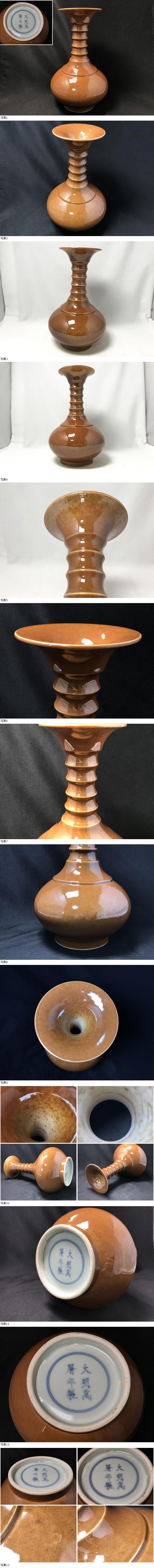 ◆大明萬暦年製 中国美術 花瓶 醤釉 柿釉 竹節文 高さ約25cm 重量約1142.5g 花生 古玩 中国古玩 唐物 煎茶道具 飾壺 古美術 骨董 收藏