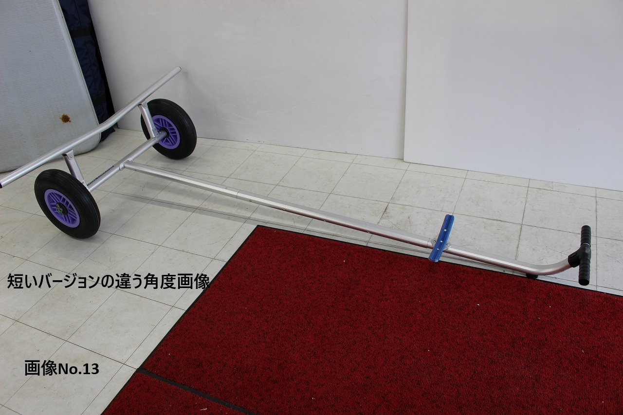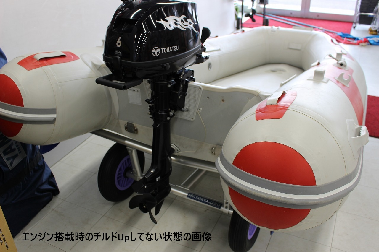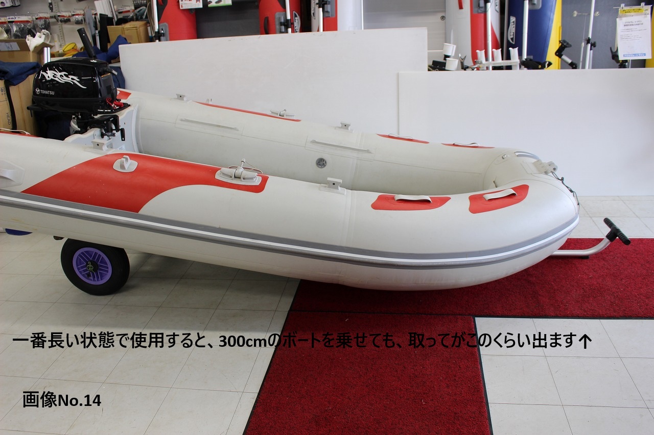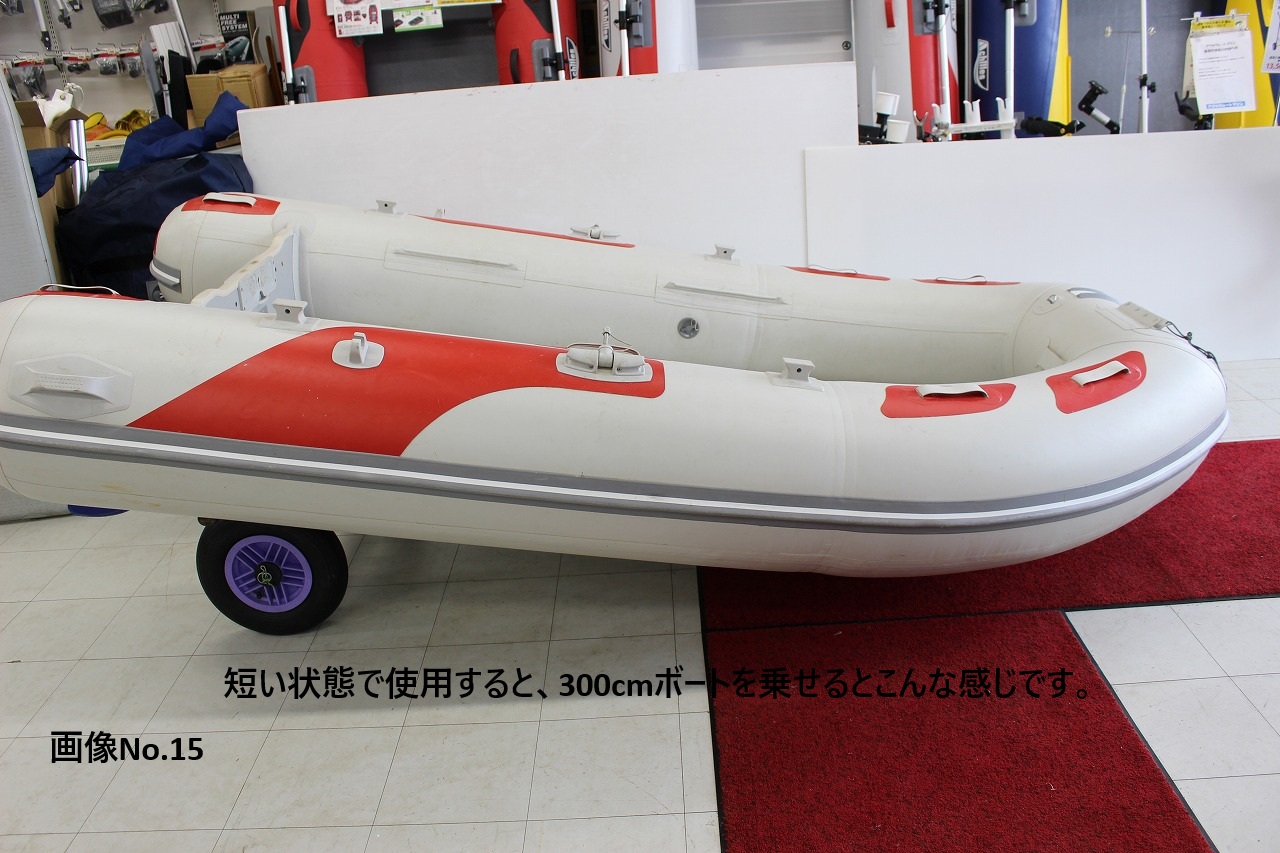 ファクトリーZERO製、ボートランチャー(後ろ受けが楕円アルミバータイプの)中古買取品です。 主にインフレータブルボート用のアイテムです。 全長は最大だと約280cm程。(自店計測)画像No.1~3参照。 真ん中のバーに長さ調節のポッチがいくつか付いており、一番縮めた長さだと、約220cm程で使用する事も可能です。(画像No.12、13、15参照) 分解も出来る為、車での収納も比較的簡単に行えます。(画像参照下さい。画像No.10) タイヤはTA30A(タイヤ外径385Φ)の物が付いているようです。(画像No.9) ボートを乗せる後ろ受けが楕円アルミバータイプになっていますので、チューブがタイヤに擦れず、FRPボートでもフラットボトムなら乗せられる仕様のようです。(メーカー説明書参照) 船外機もチルトダウンして運ぶ事が出来ますので、あると便利なアイテムです。 タイヤが付いていないボートの移動や、ボートを一時保管する時等にも重宝すると思います。 比較的程度も悪くないアイテムにつき、興味のある方にはおススメ出来る商品です。 ※イメージの為にパワーボート(300cm)を乗せたり、エンジンを付けた画像も掲載します。参考にしてみて下さい。(画像No.14~17) ※出品はボートランチャーのみです。ボート等は違いますので、お間違いのないようにお願いします。(ご落札後にボートが無い等のクレームは無しでお願いします) 気になる点がありましたら、入札前に必ず質問お願いします。 | |||||||||||||||||||||||||||||||