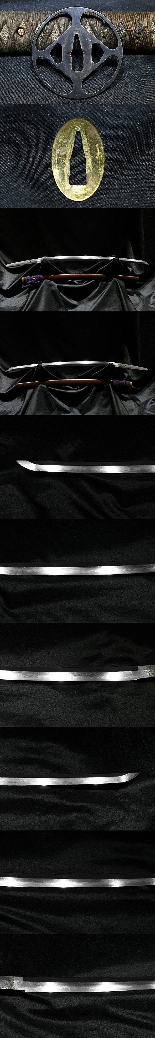 表【無銘】 裏【-】 種別: 刀 サイズ:長さ 二尺八分・測定すると63cm程でした 反り: 六分 目くぎ穴 1個 元幅:約 3.117cm 元重:約 0.733cm 先幅:約 2.165cm 先重:約 0.534cm 刀身重量:約 692.1g(ハバキ・柄をとった状態) ハバキ重量:約 32.7g |