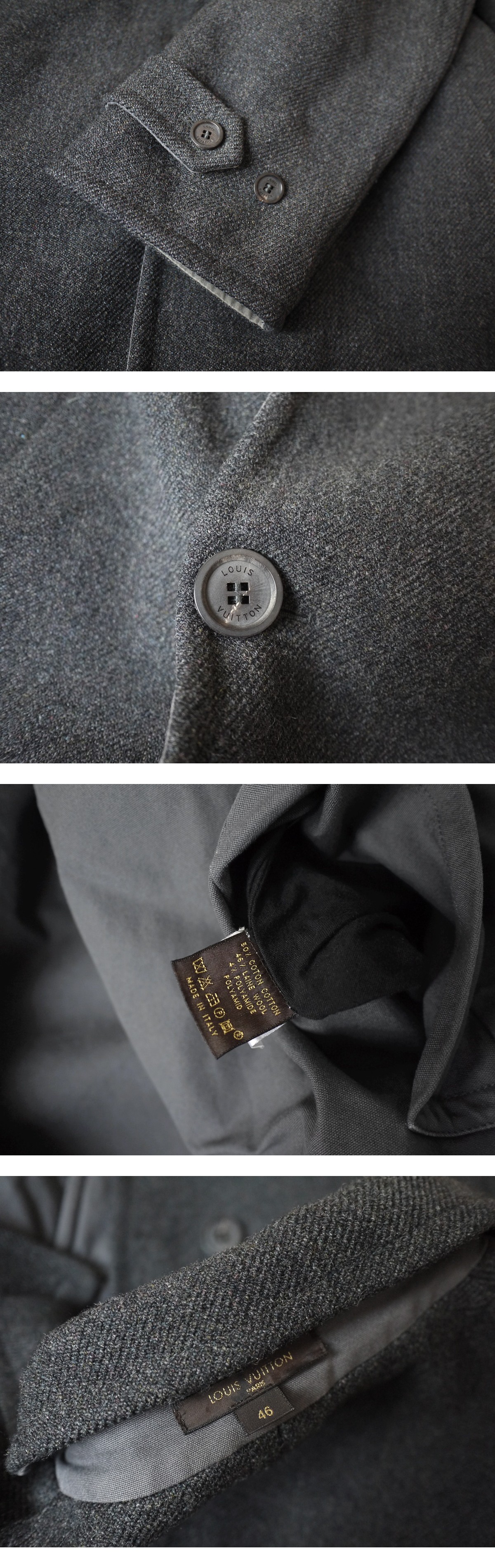 brand LOUIS VUITTON made in Italy price \561,000(参考上代) material wool 50% cotton 46% polyamide 4% color charcoal gray size 46 肩幅48 着丈89 袖丈64 身幅54(多少の誤差はご了承ください。) 状態 比較的使用感の少ないきれいなお品物です。特筆すべきダメージは見受けられず末永くご使用頂ける状態です。 |