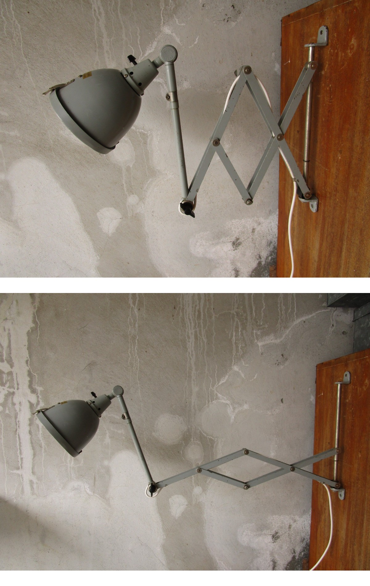 クロス部が2か所のみで構成されたシンプルなスタイルのシーザーランプで、伸縮は片手でもできるくらい気持ちよく動かせ、全体の伸縮および左右、シェード部分のアームの左右、前後と機能面で申し分のない作りで、バウハウス期の機能美が感じられる、よく作り込まれた良品です。ほぼ発売時のオリジナルペイントで、シェード部分にガードの付く希少性の高い1品です。ガードカバ内のアクリル板、電線コードは新しく付け替えてあります。付け根部分のシャフトの上下2か所でねじ止め固定するタイプです。