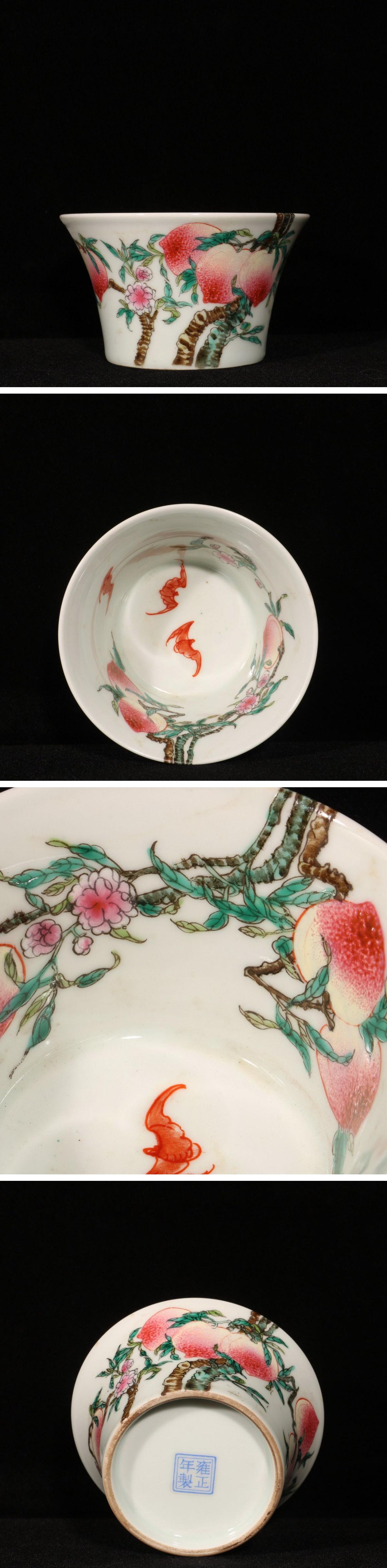 【清】関西某オークション購入 中国伝来 清時代物 大清雍正年製 粉彩九桃福寿紋茶碗 当時物 時代コレクション8L1-YS3 收藏