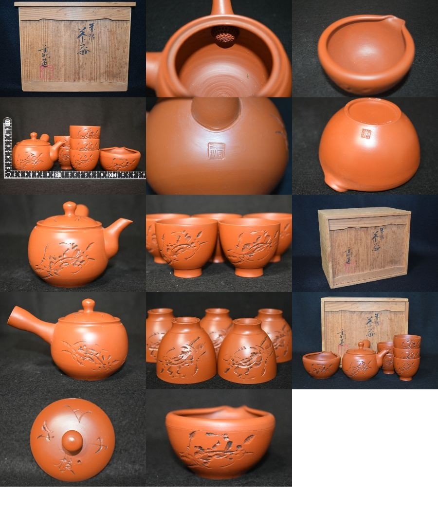 【光成】煎茶道・常滑名工・渡辺干洞「朱泥・蟹彫文・煎茶器揃」未使用・全印刻④
