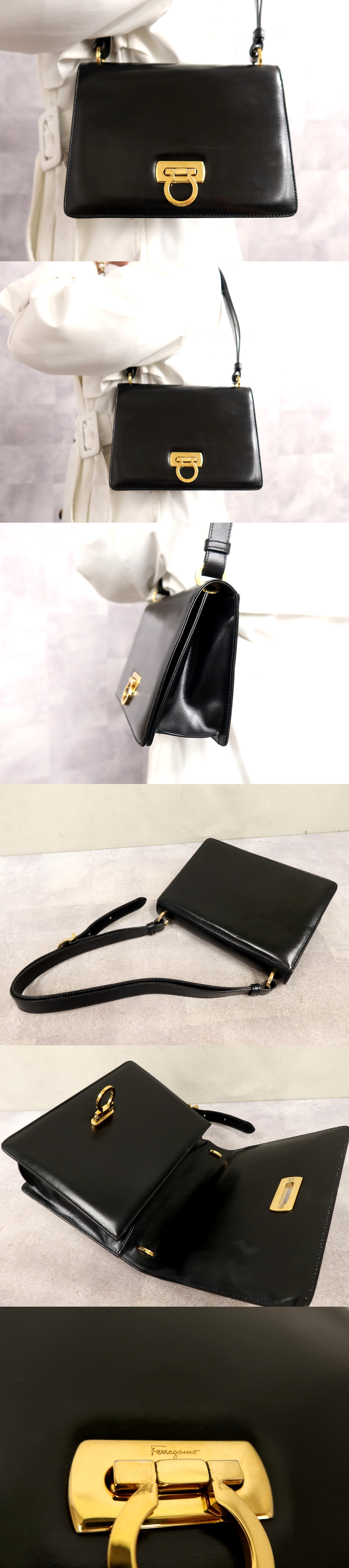 ●超美品●Salvatore Ferragamo フェラガモ●ガンチーニ●フラップ●カーフ レザー 本革●ショルダー バッグ●黒●ゴールド金具●Js66889 收藏