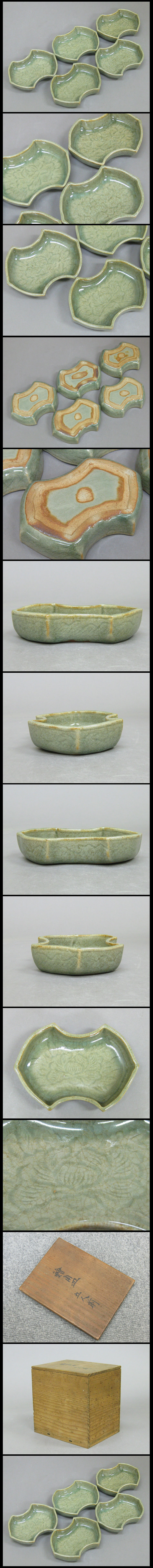 【心庵】青磁 花文分銅型/膾角皿 なます皿 5客 付箱 B948 收藏