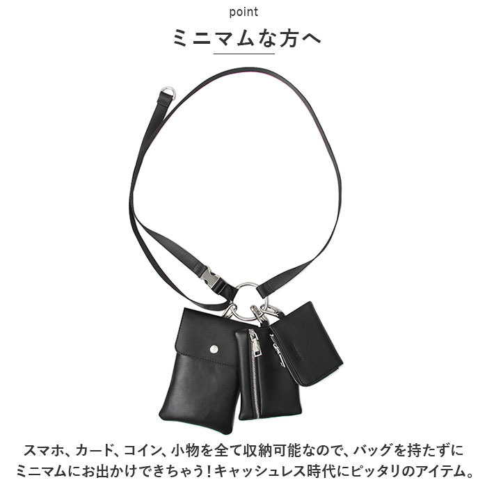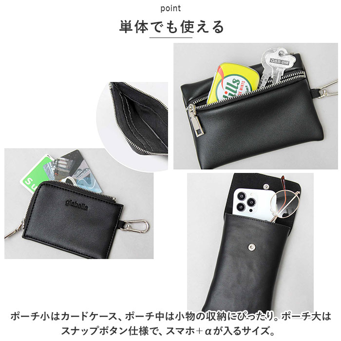 | 商品説明 | ・・組み合わせは自由自在☆マルチに使える3連ポーチでミニマムにお出かけ!「glabella MULTIRING SHOULDERBAG」が登場。 ・【ミニマムな方へ】 ・スマホ、カード、コイン、小物を全て収納可能なので、バッグを持たずにミニマムにお出かけできちゃう!キャッシュレス時代にピッタリのアイテム。 ・【3連タイプ】 ・大小3つのポーチをリングで束ねた3連タイプのショルダーバッグ。アクセサリー感覚で身に着け、そのままお出かけできる優れモノ☆ ・【単体でも使える】 ・ポーチ小はカードケース、ポーチ中は小物の収納にぴったり。ポーチ大はスナップボタン仕様で、スマホ+αが入るサイズ。それぞれ単体でも使用できる! ・【組み合わせ自由】 ・ポーチの組み合わせは自由自在。用途に合わせて変えられるので便利◎ショルダー紐は長さ調節可能。 ・【オールブラック】 ・オールブラック×シルバーで高見え効果あり♪細かなシボ感と光沢が控えめなマットなフェイクレザー。お手入れが簡単なのも嬉しいポイント。 ・【ハンズフリー】 ・両手があくハンズフリーの状態にできるので、レジャーやイベント、お出かけにぴったり!子育て中のママパパにも◎ ・【トレンド感】 ・ファッションアイテムとしても使える、トレンド感のあるマルチポーチ。いつものコーデにプラスすればこなれ感がUP☆ ・【ポケット仕様】 ・ポーチ小:カードポケット×3 |