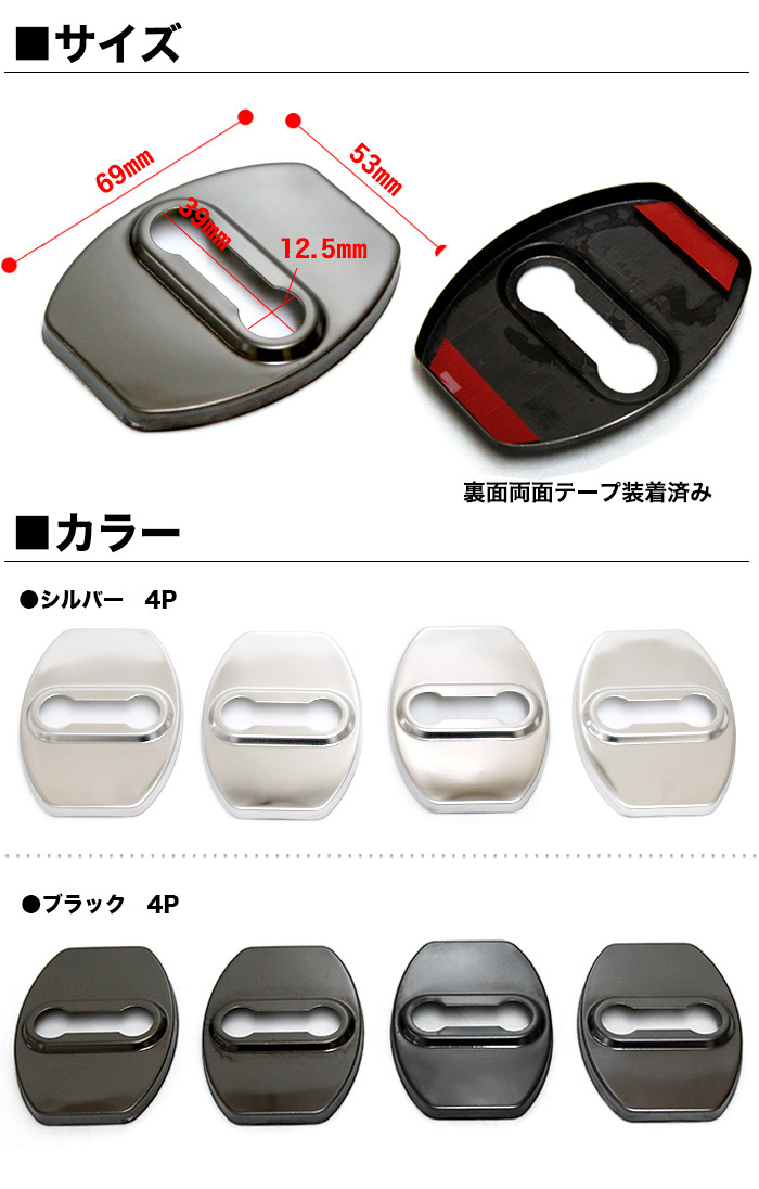 | ■ステンレス製ドアロックカバー 4Pセット ■素材:ステンレス ■カラー:シルバー ■適合車種 【トヨタ】 86 ZN6系 H24.4〜 bB QNC2♯系 H17.12〜 iQ KGJ10/NGJ10系 H20.11〜 ist P11#系 H19.7〜 RAV4 ACA3#W系 H17.11〜 アクア NHP10系 H23.12〜 アベンシス ZRT272W系 H23.9〜 アリオン T24#系/T26#系 H13.12〜 アルファード H2#W系 H20.5〜 イプサム ACM2#W系 H13.5〜H21.12 ヴァンガード ACA3#W/GSA33W系 H19.8〜 ウィッシュ NE1#系/ZGE2#G/ZGE2#W系 H15.1〜 ヴィッツ P9#系 H17.2〜H22.12 ヴェルファイア H2#W系 H20.5〜 ヴォクシー AZR6#G系/ZRR7#W/ZRR7#G系 H13.11〜 エスティマ CR30W/CR40W系/R5#W系/AHR20W系 H12.1〜 オーリス ZRE15#H/NZE15#H系/ZRE186H/NZE18#H系 H18.10〜 カムリ ACV4#系/AVV50系 H18.1〜 カローラ アクシオ E14#系 H18.10〜H24.5 カローラ フィールダー E14#G系 H18.10〜H24.5 カローラ ルミオン NZE151N/ZRE15#N系 H19.10〜 サクシード ワゴン P5#G系 H14.7〜 シエンタ NCP8#G系 H15.9〜 スペイド NCP14#/NSP140系 H24.7〜 ノア AZR6#G系/ZRR7#W/ZRR7#G系 H13.11〜 ハイエース ワゴン H1##G/H1##W系 H1.8〜H16.8 パッソ KGC1#/QNC10系/KGC3#/NGC30系 H16.6〜 ピクシスエポック LA300A/LA310A系 H24.5〜 プリウス NHW20系/ZVW3#系 H15.9〜 プリウスα ZVW4#W系 H23.5〜 ブレイド AZE15#H/GRE156H系 H18.12〜H24.4 プレミオ T24#系/T26#系 H13.12〜 プロボックス ワゴン P5#G系 H14.7〜 ポルテ NNP1#系/NCP14#/NSP140系 H16.7〜 マークX GRX12#系/GRX13#系 H16.11〜 マークXジオ ANA1#/GGA10系 H19.9〜 ラウム NCZ2#系 H15.5〜H23.10 ラクティス CP10#系 H17.10〜H22.11 ランドクルーザー・プラド UZJ200W/URJ202W系 H19.9〜 ランドクルーザー・プラド GRJ15#W/TRJ150W系 H21.9〜 【スバル】 BRZ ZC6系 H24.3〜 ステラ LA100F/LA110F系 H23.5〜 デックス M401F/M411F系 H20.11〜H23.12 プレオ L275F/L285F系 H22.4〜 プレオプラス LA300F/LA310F H24.12〜 ルクラ L455F/L465F系 H22.4〜 【ダイハツ】 エッセ L235S/L245S系 H17.12〜H23.9 タント L375S/L385S系 H19.12〜 タント エグゼ L455S/L465S系 H21.12〜 ブーン M60#S/M610S系 H22.2〜 ミラ L275S/L285S系 H18.12〜 ミラ イース LA300S/LA310S系 H23.9〜 ミラ ココア L675S/L685S系 H21.8〜 ミラ ジーノ L650S/L660S系 H16.11〜H21.4 ムーヴL15#S/L160S系 H14.10〜H18.10 ムーヴLA100S/LA110S系H22.12〜 ※その他の車種でも形状が合えば取付可能です。 ※必ずサイズをご確認の上、ご購入をお願いいたします。 |