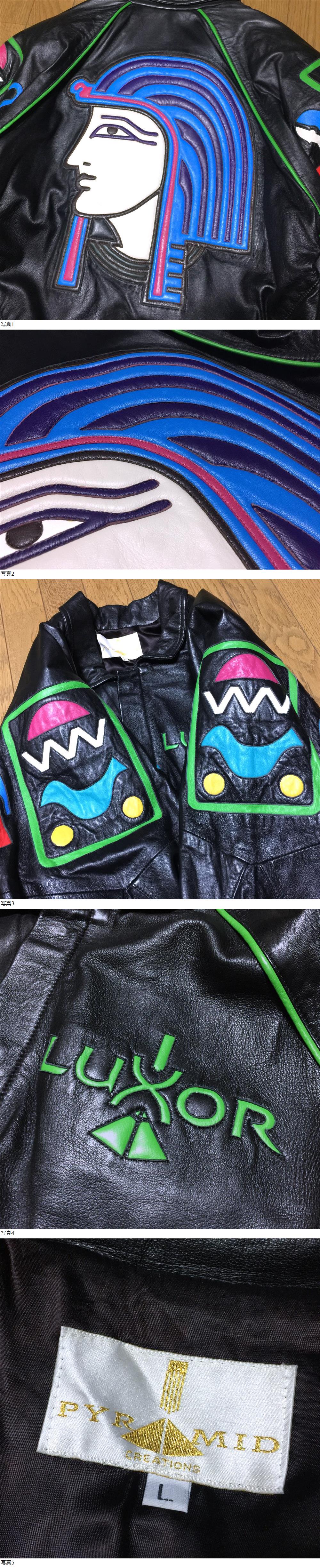 | 【ブランド】 PYRAMID CREATIONS ピラミッド クリエーションズ LUXOR ルクソールホテル 【デザイン・モデル】 豪華 ファラオ ツタンカーメン 羊革 オールレザー スタジャン ブルゾン ジャケット 【生産】 【詳細・コメント】 PYRAMID CREATIONS ピラミッド クリエーションズ オールレザースタジャンになります。アメリカ・ラスベガスにあるエジプトの古代文明をテーマにしたピラミッド型のリゾートホテル「LUXOR ルクソールホテル」のスーベニアジャケット。古代エジプトのファラオ・ツタンカーメンが背面に大きくデザインされ、ミステリアスな雰囲気のデコレーションが施された存在感抜群の逸品。やわらかく滑らかな高級羊革ラムレザーを使用、オールレザーの豪華な仕上がりです。フロントは比翼仕立てのスナップボタン開閉。 正規品です。 【サイズ】 表記: L ※実寸を参考にして下さい。 平置実寸:身幅60㎝ 着丈70cm 裄丈92㎝ 脇下から袖先52㎝ ※多少の誤差はご了承ください。 【カラー・パターン】 ブラック ×マルチ ※ご覧になられるモニターや、デジカメの撮影具合によって色味が異なる場合がございますのであらかじめご了承ください。 【品質】 表記タグ無し 表地:本革(きめ細かく滑らかな質感で、羊革です) 裏地:アセテート・ナイロン系 【コンディション】 USED 中古品です。レザー特有のシワ・薄スレ・小傷など多少の使用感ございますが、目立ったダメージは無く状態は良好です。まだまだ着ていただけます!※写真参考に判断して下さい。ユーズドアイテムにご理解ある方のみご入札お願い致します 。 | |||