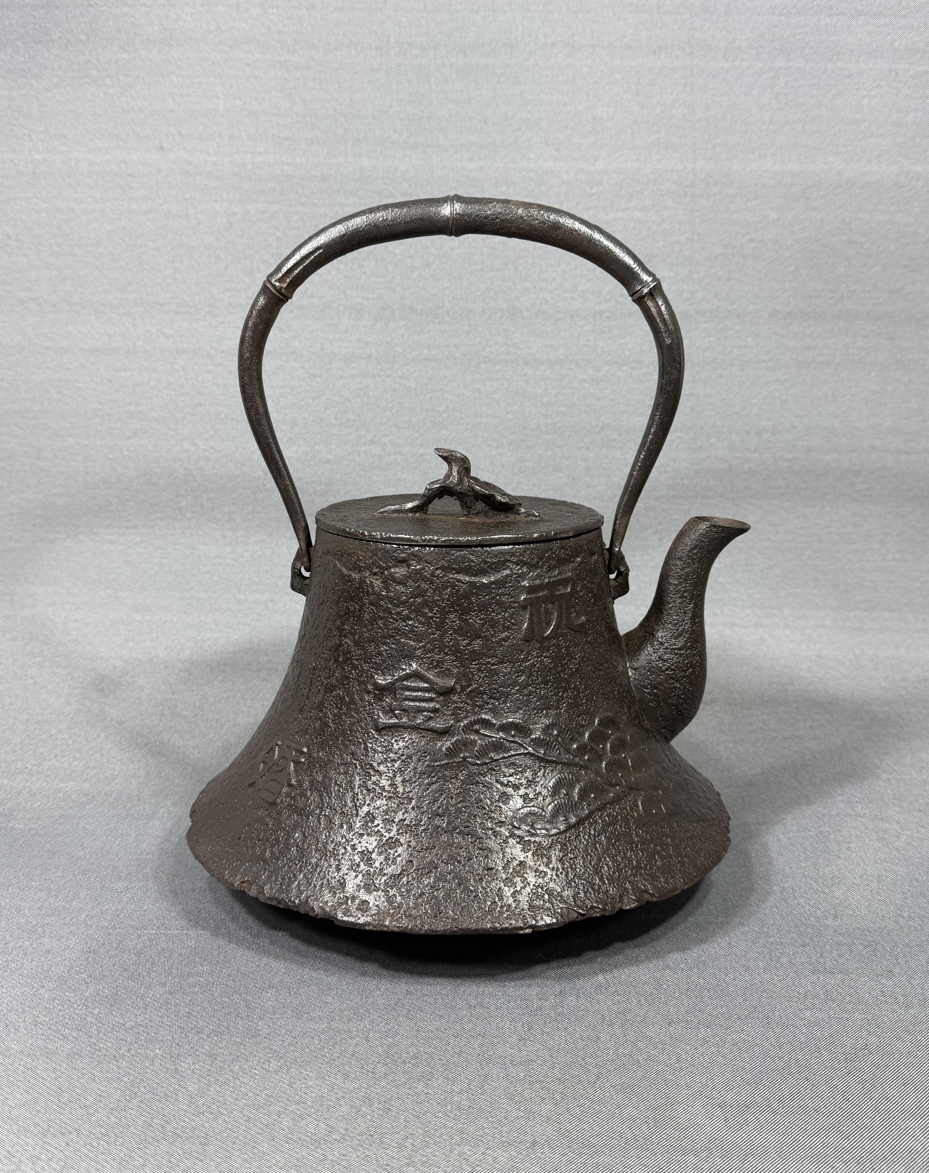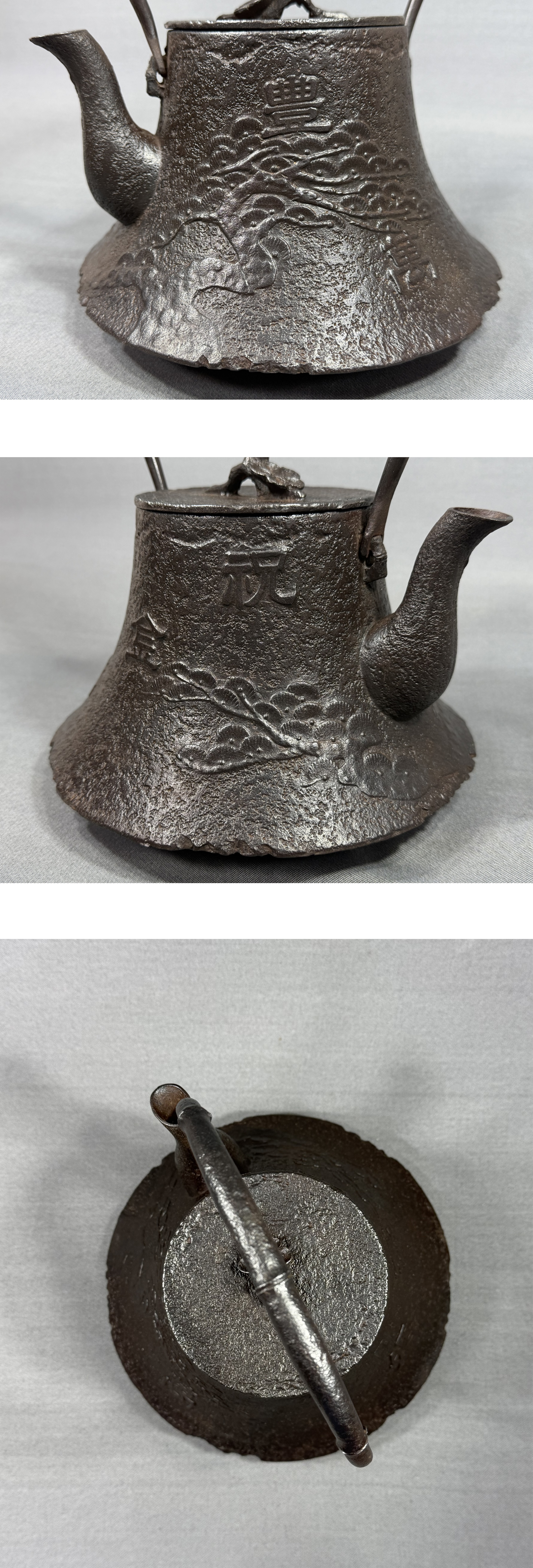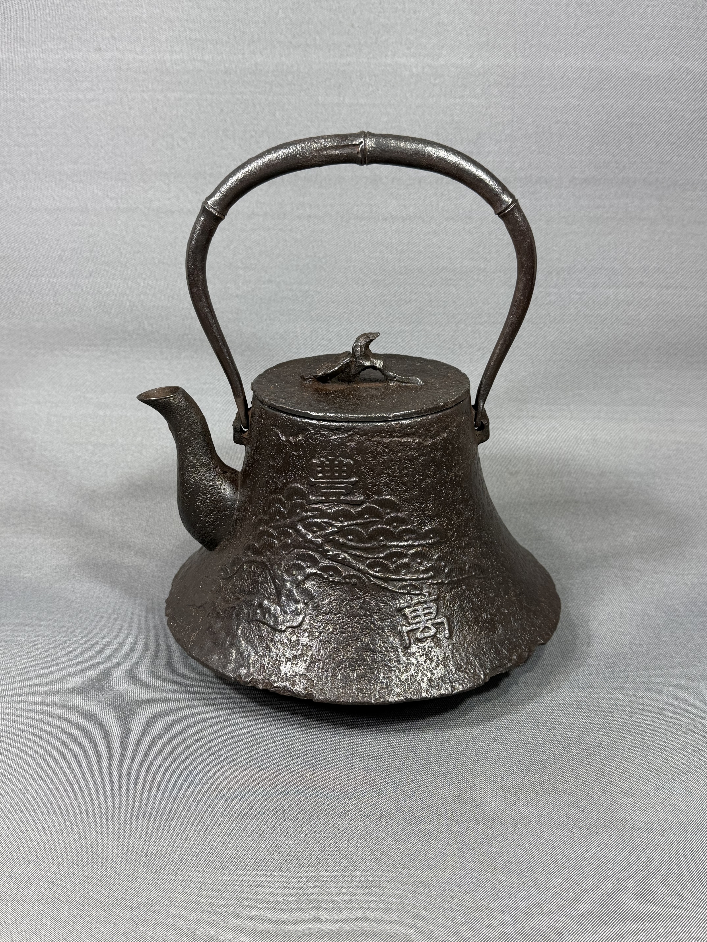 【風車】 南部盛岡 名工 喜助之作 鉄地捻梅花摘蓋 竹形提手 松文 鉄瓶 ▲銘:岡崎 祝金婚▲急須 鐵壷 煎茶道具 收藏