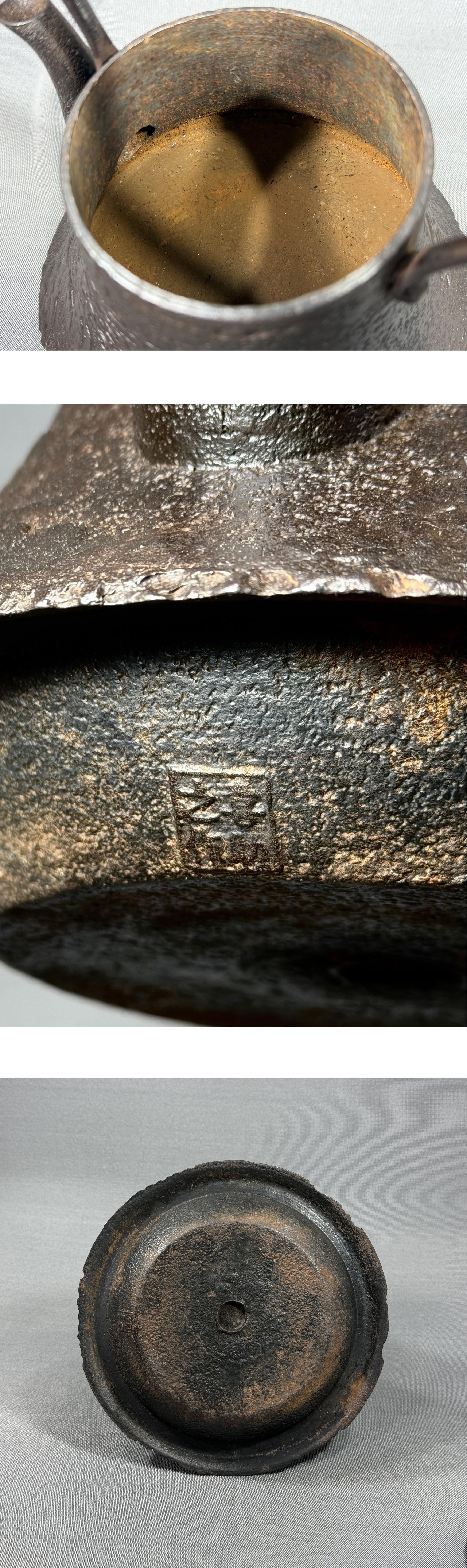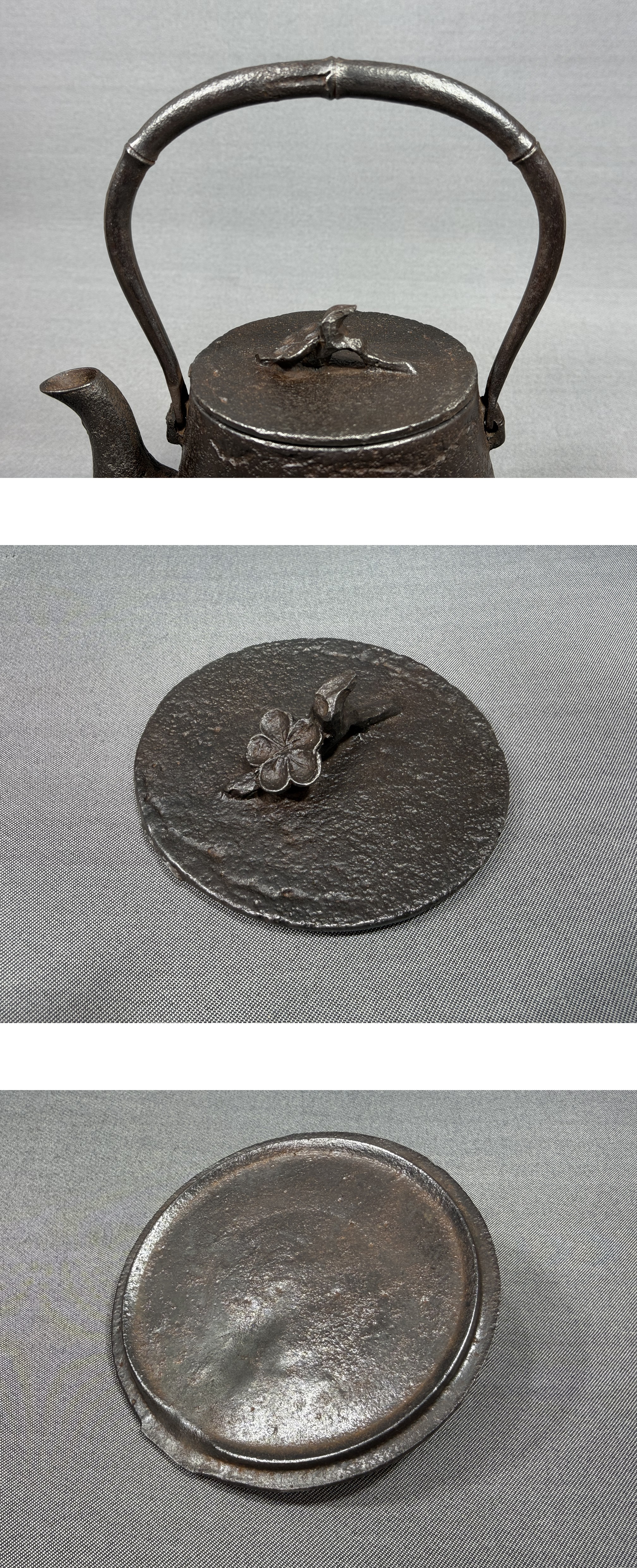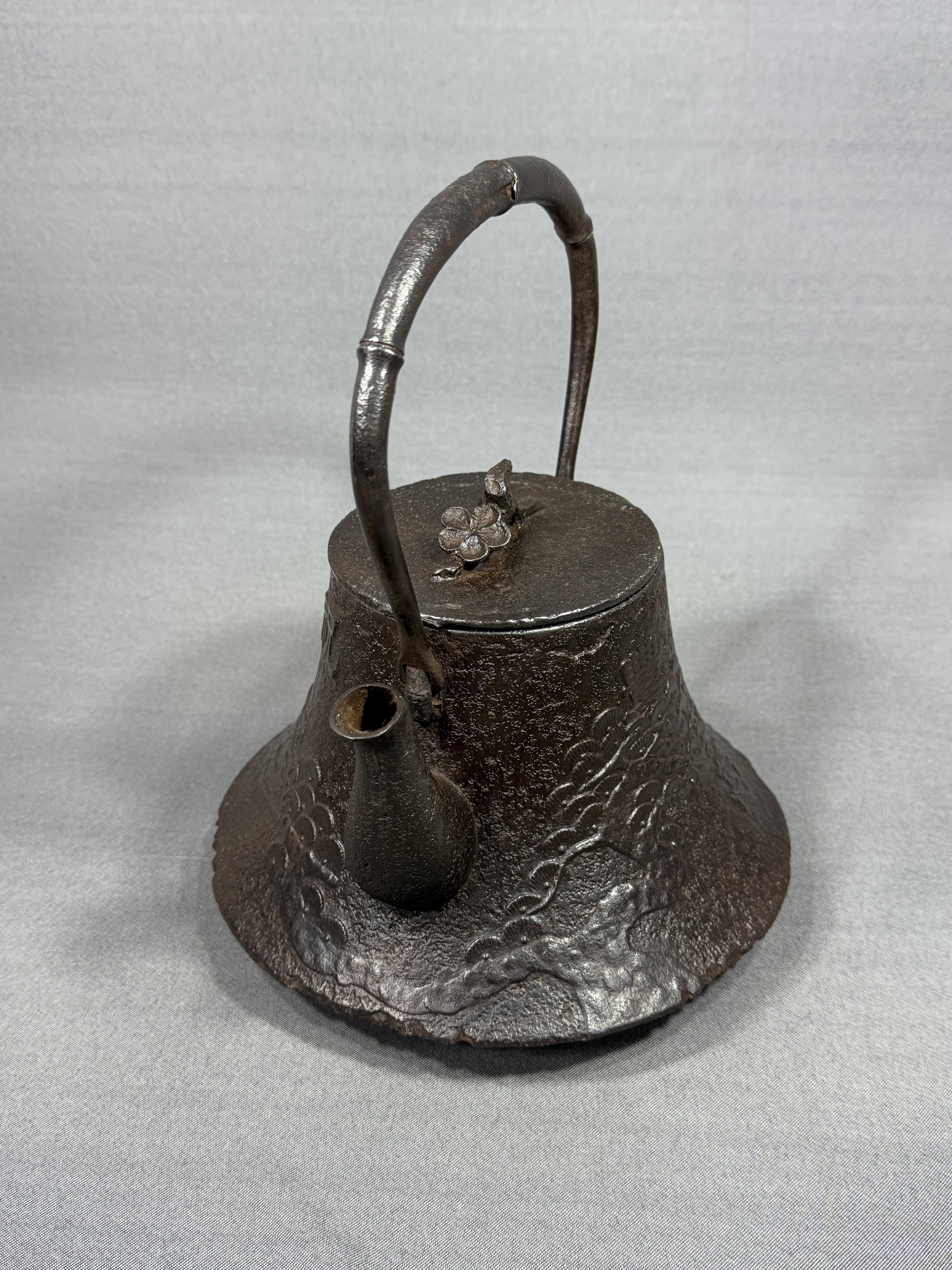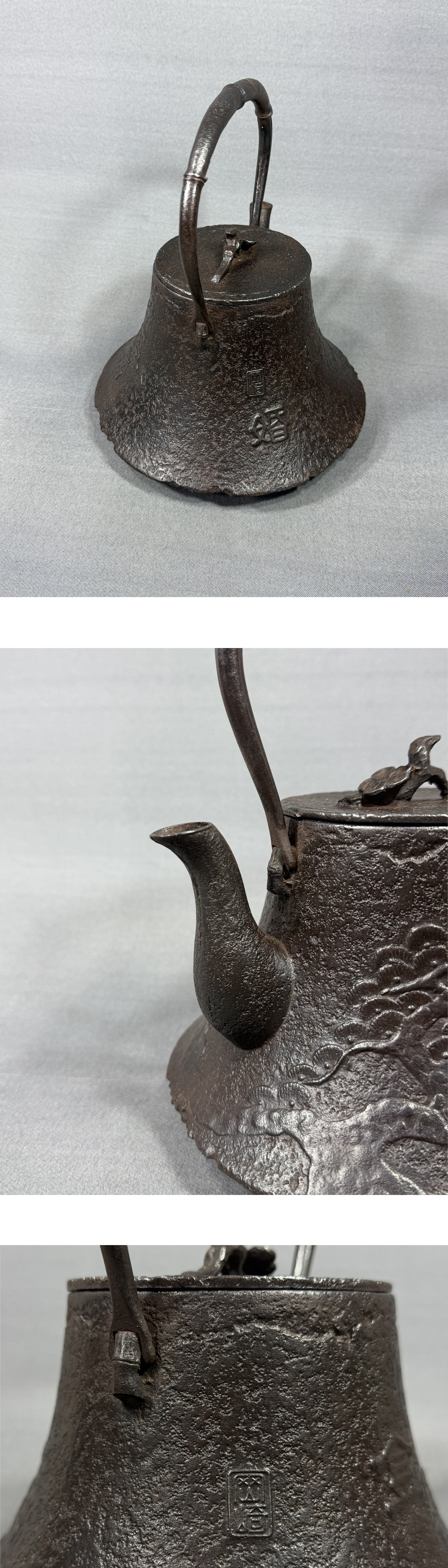 【風車】 南部盛岡 名工 喜助之作 鉄地捻梅花摘蓋 竹形提手 松文 鉄瓶 ▲銘:岡崎 祝金婚▲急須 鐵壷 煎茶道具 收藏