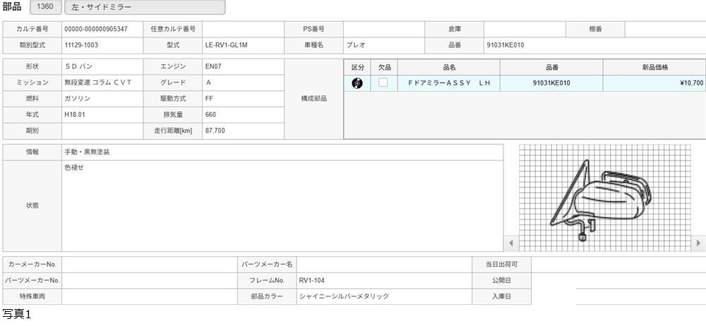 H18年 RV1 プレオ 左 ドアミラー 手動・塗りなし黒 /送料 ミニ/905347 收藏