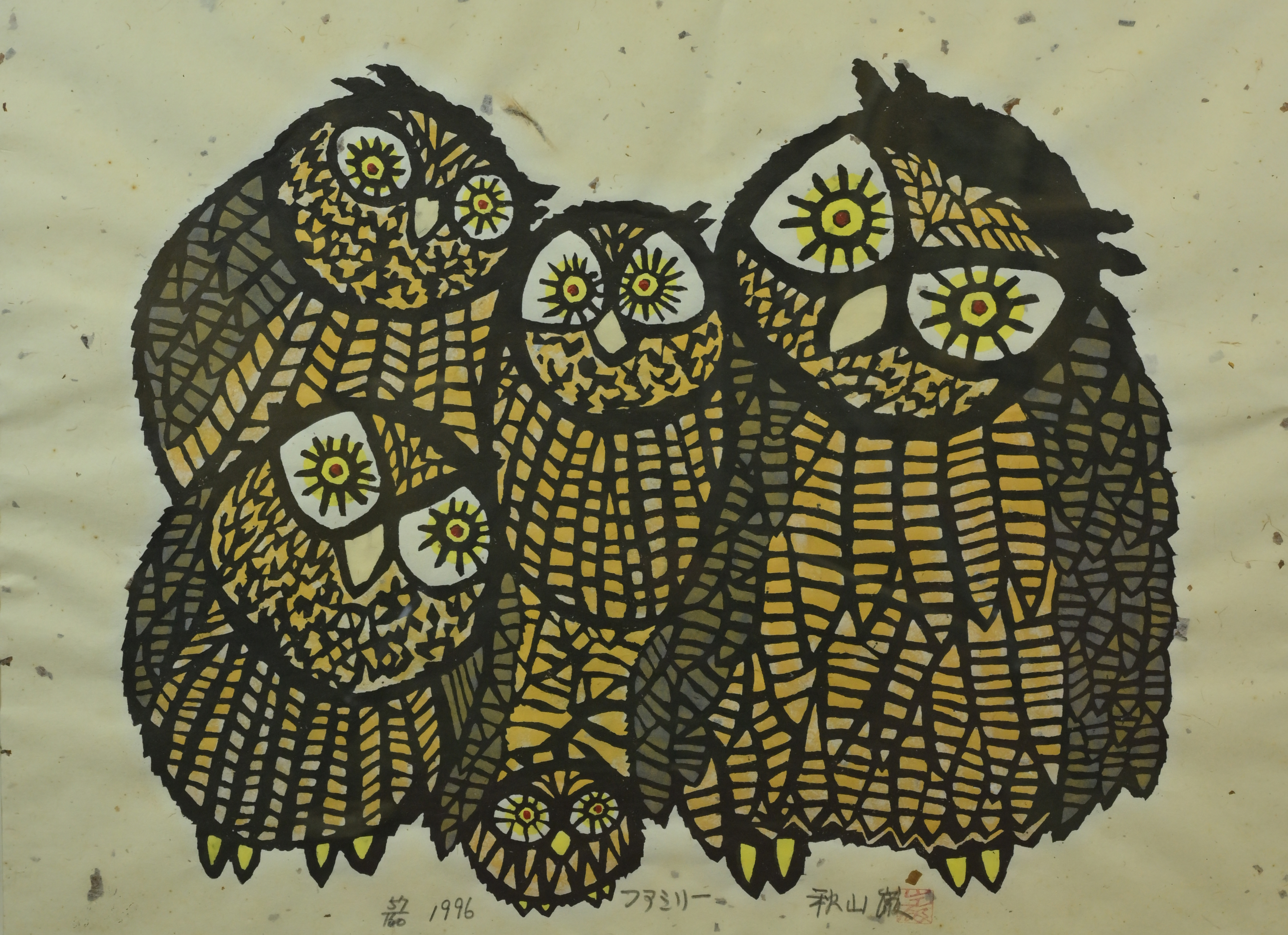 | 略歴 | 秋山巌 1921-2014 大分県出身.版画家。1953年に太平洋美術学校卒業後、棟方志功、布施信太郎、布施悌次郎らに師事。日本の土俗文化への関心が深く、フクロウなどの動物をはじめ、民話や仏教説話、種田山頭火の俳句などを題材にした作品を数多く発表しました。 |